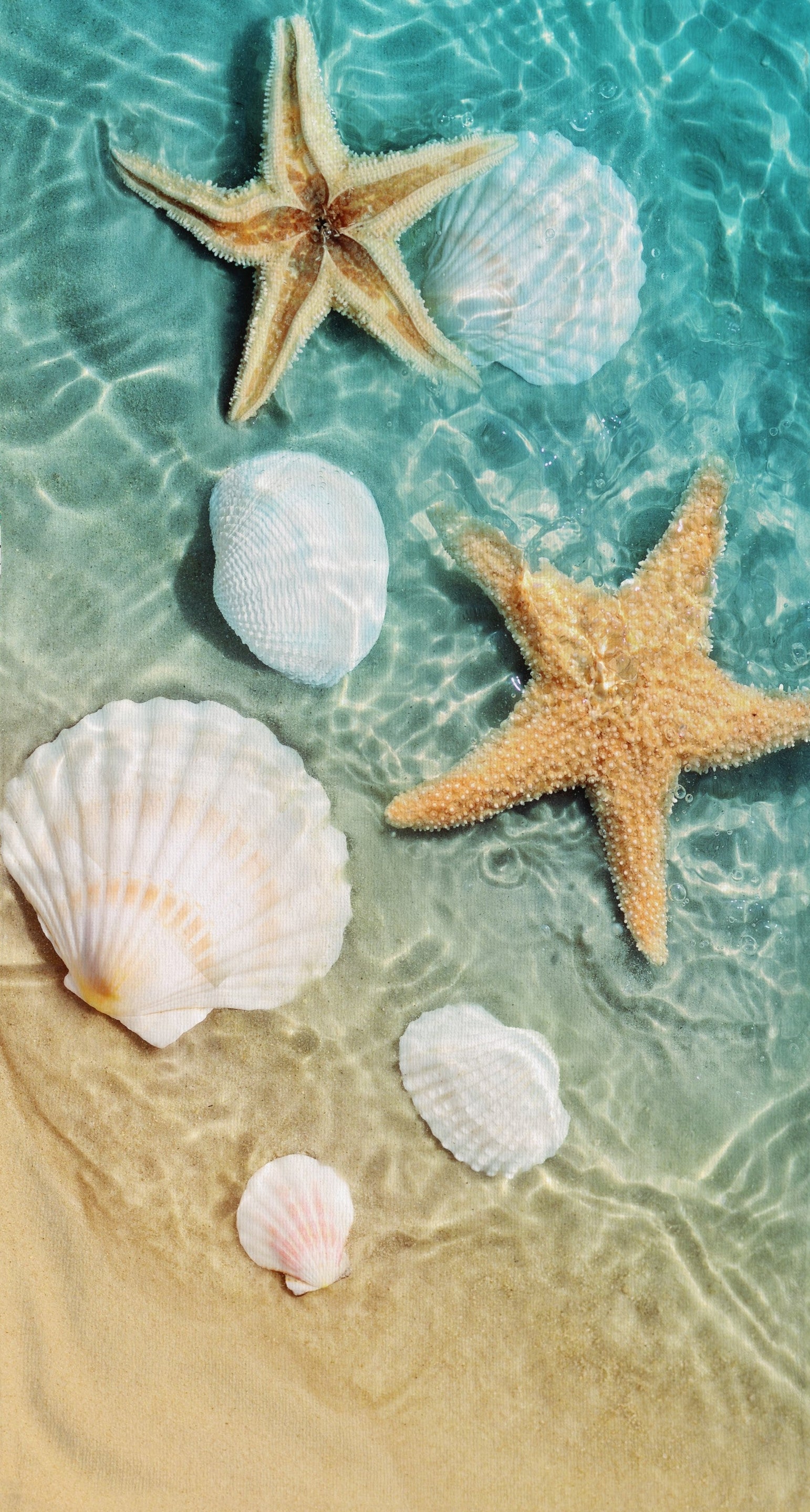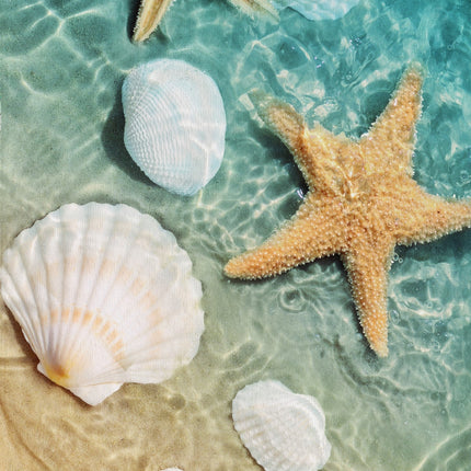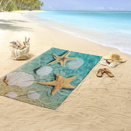 Strandlaken 100x180 cm - Zeesterren en Schelpen Print - Poly Velours - Good Morning - Zand en Zee Thema