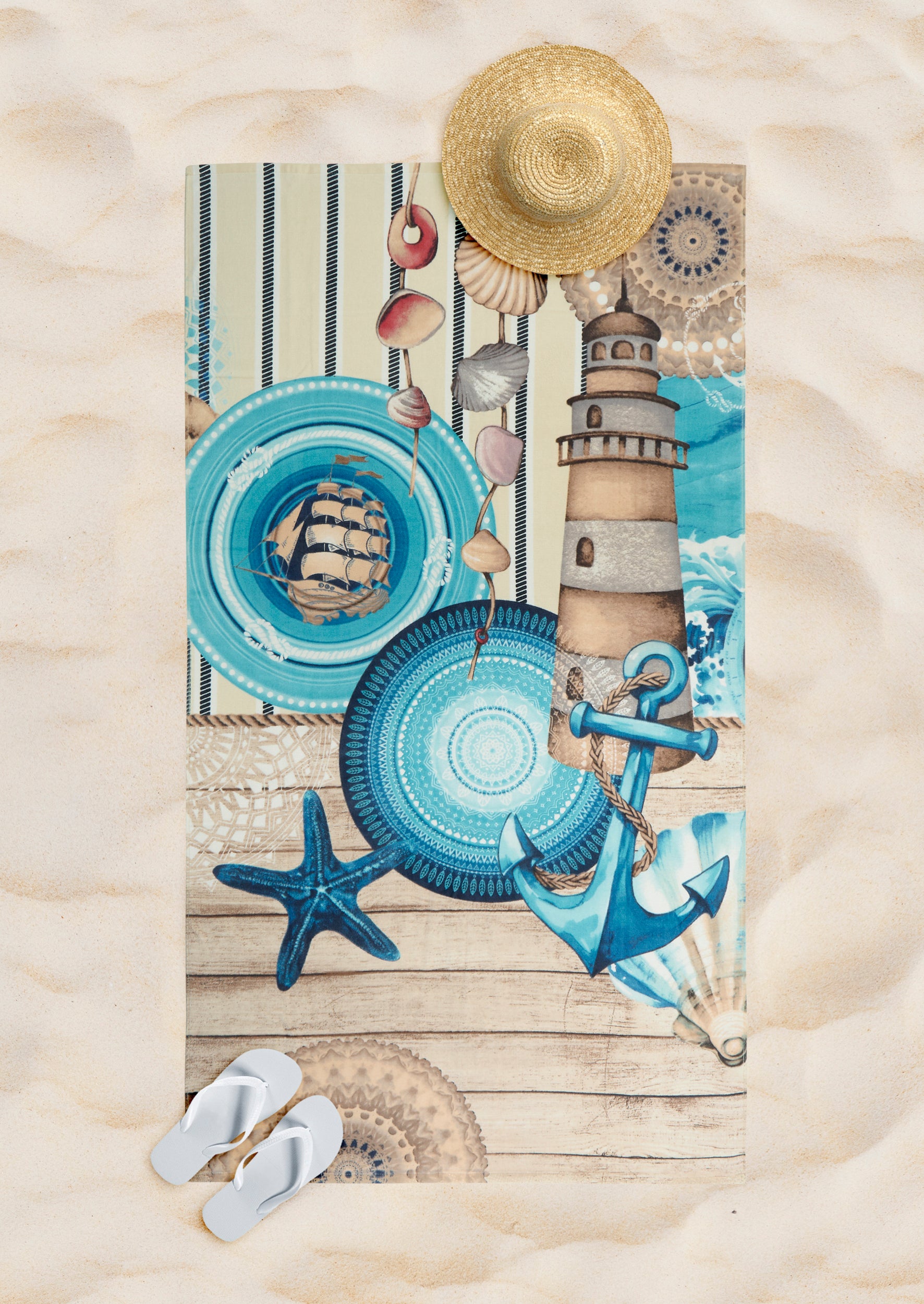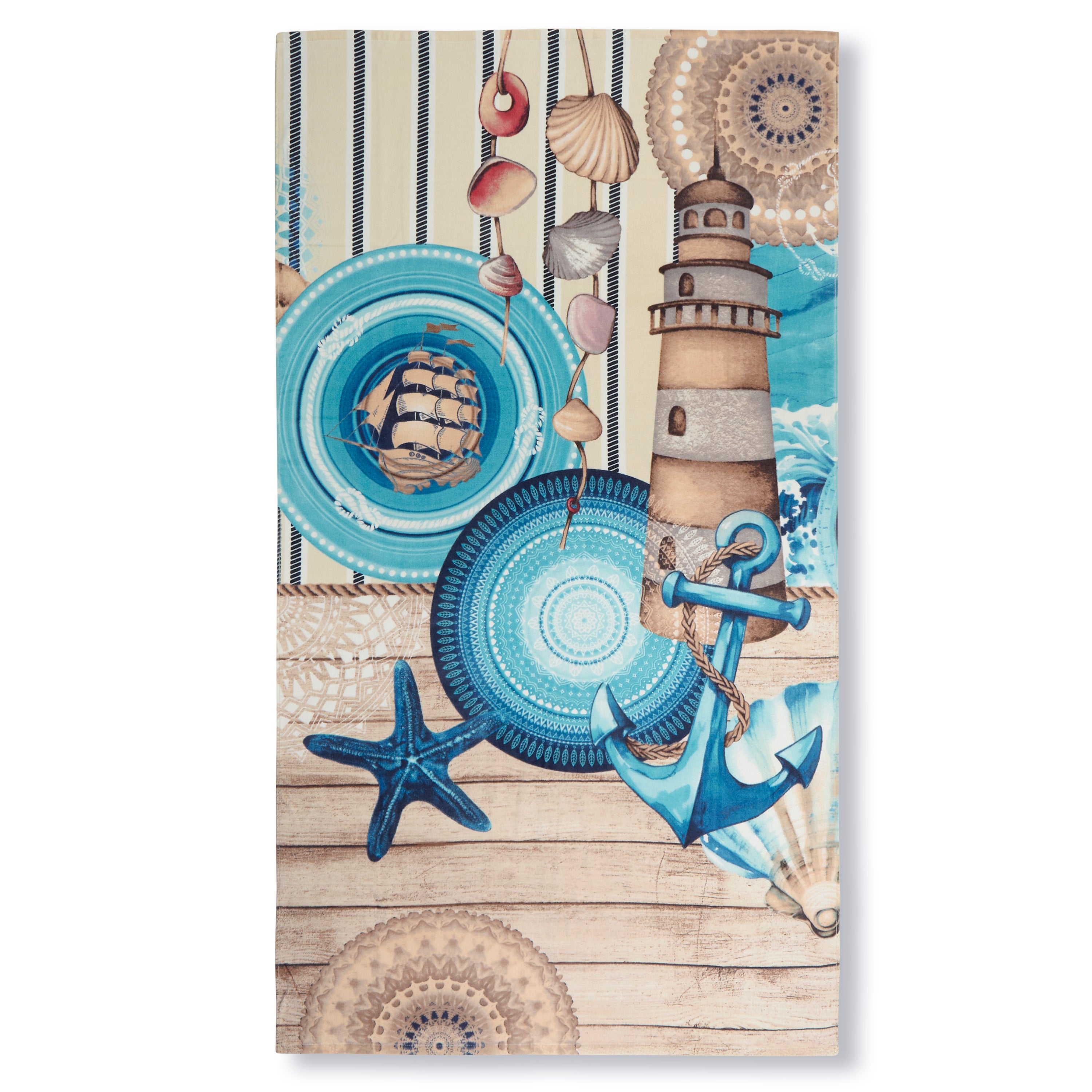 Strandlaken 100x180 cm - Maritiem Ontwerp met Vuurtoren en Schelpen - Blauw - 100% Katoen Velours - Oeko-Tex Gecertificeerd