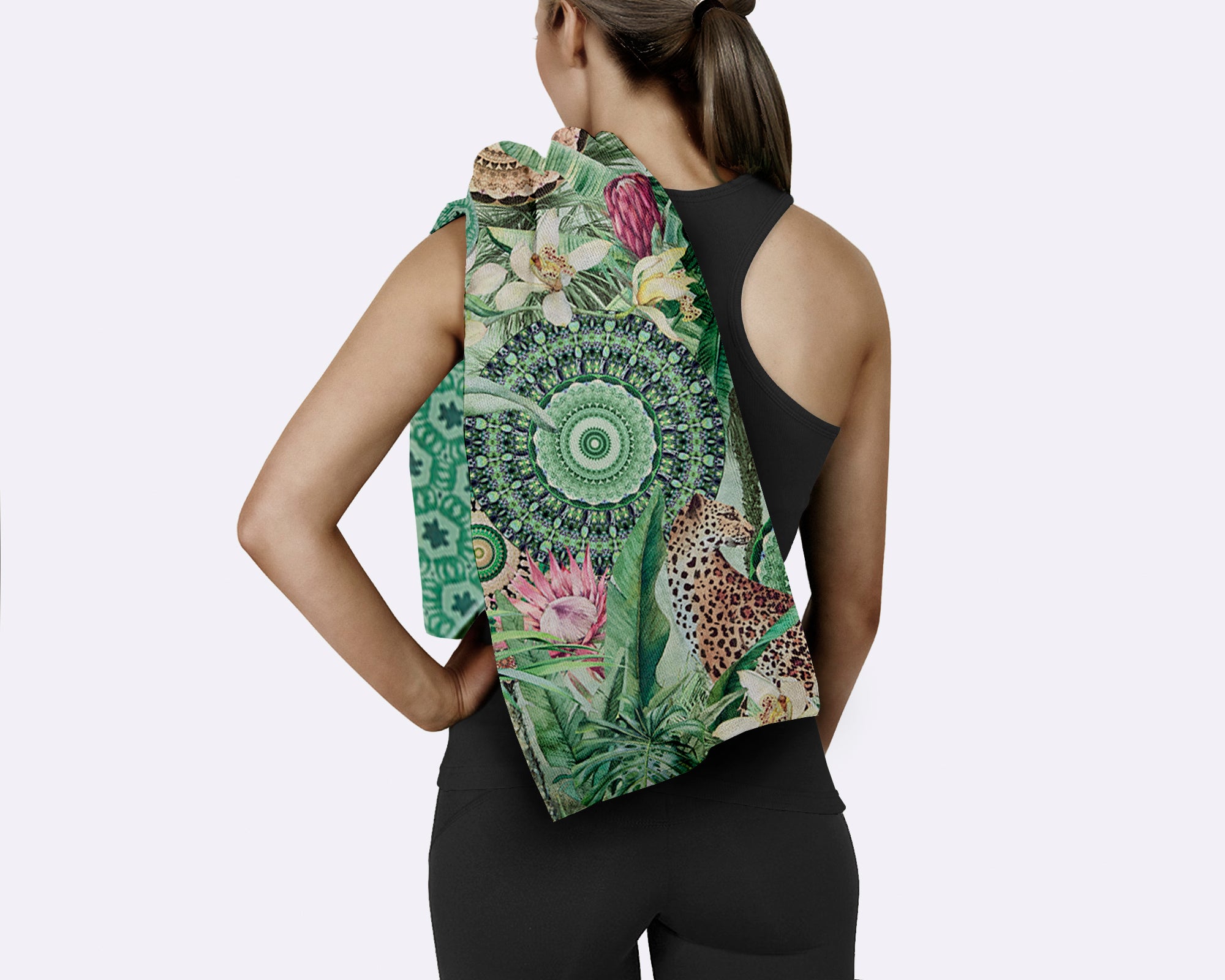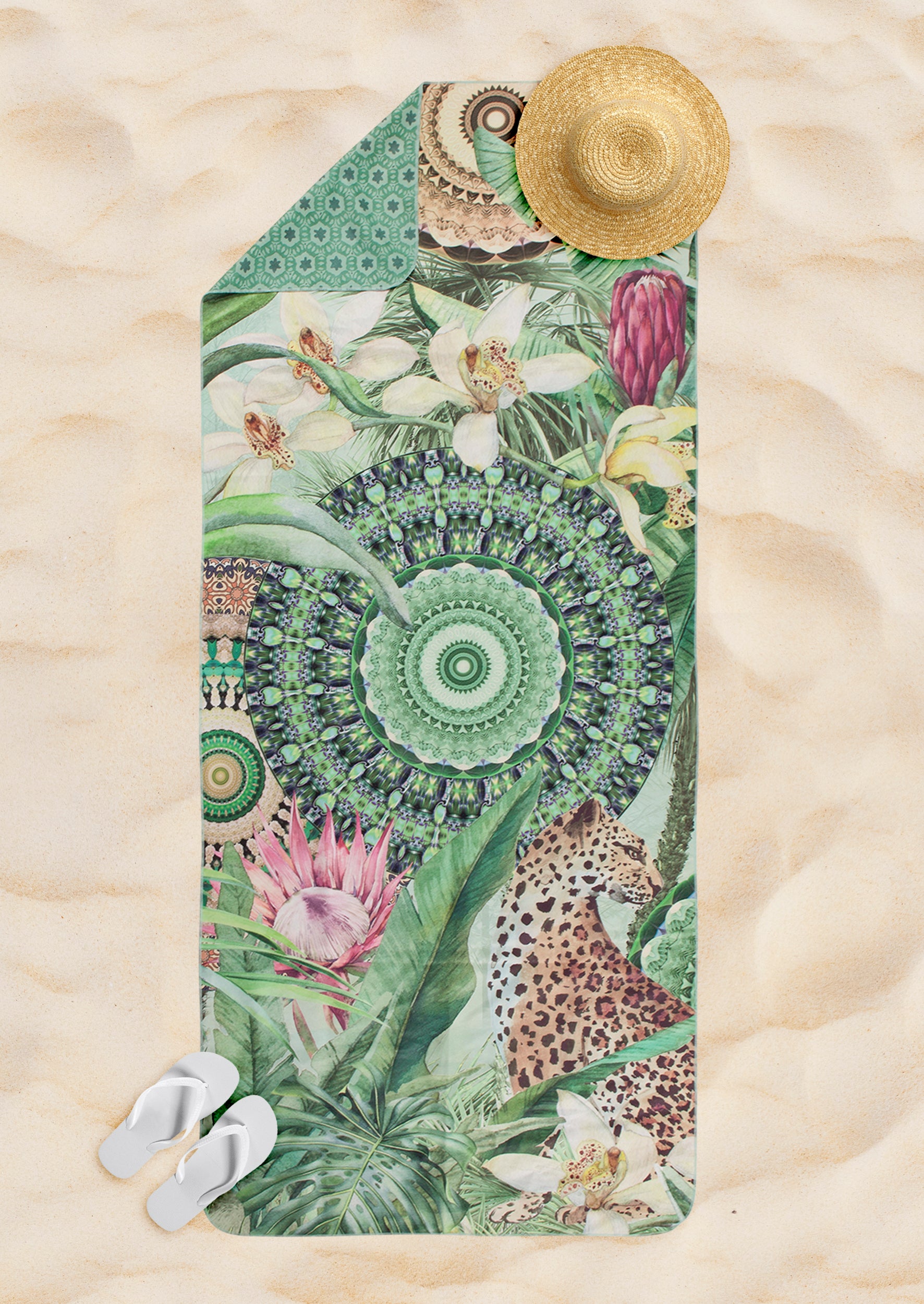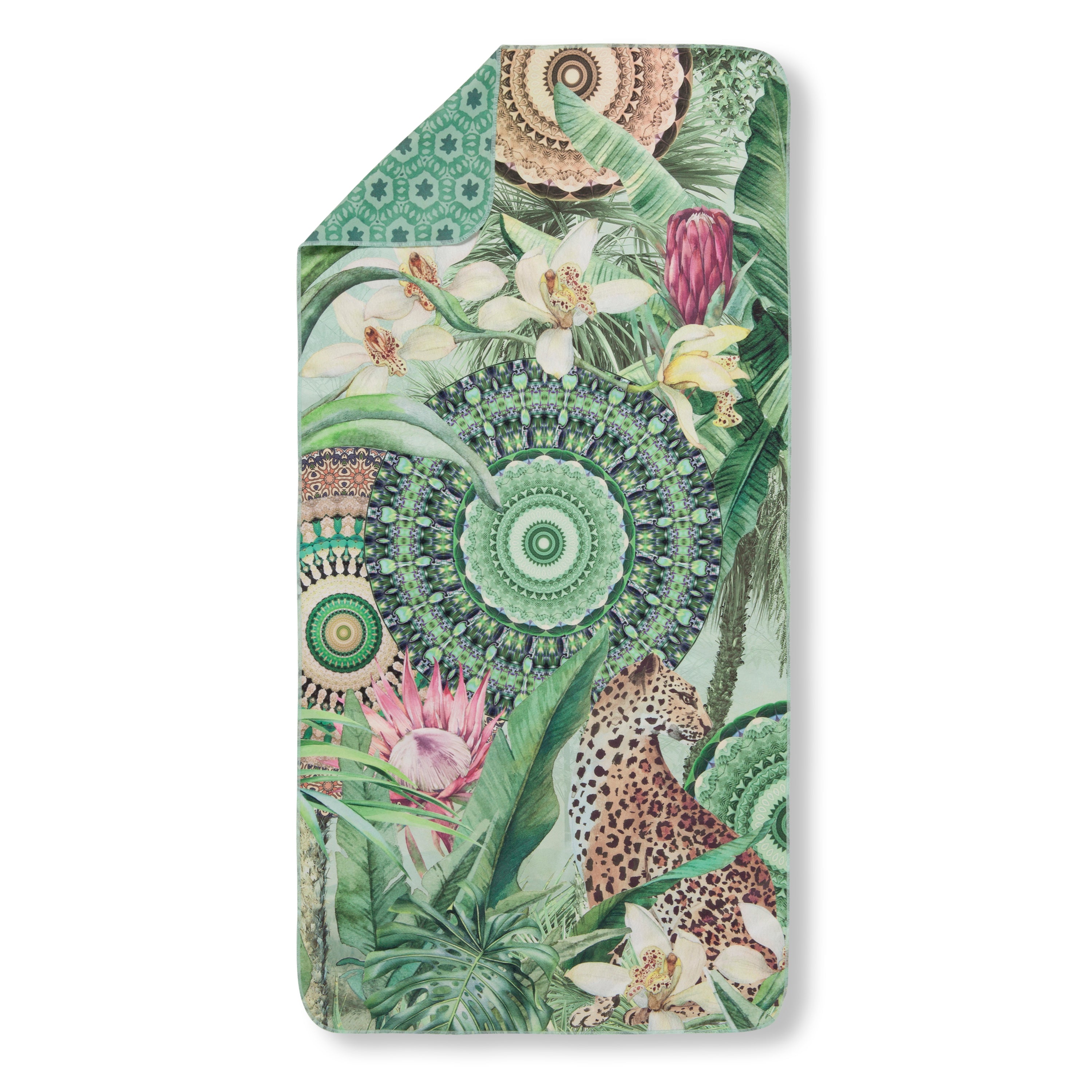 Strandlaken 50x100 cm - Tropisch Luipaard en Bloemen Print - Groen - Polyvelvet - Voor Sport & Reizen