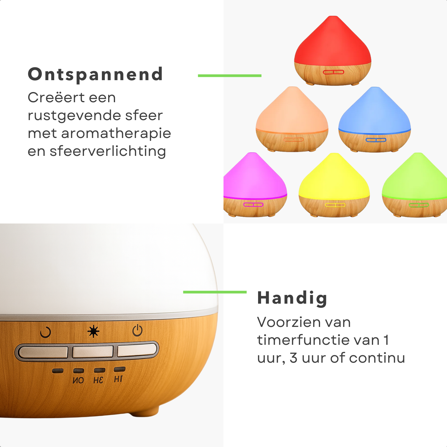 Cheqo® Aroma Diffuser LED - Luchtbevochtiger - Geurverspreider - Aromatherapie Diffuser - Etherische Olie Verstuiver - LED Sfeerverlichting - Stille Werking - USB Type-C Voeding - 300 Ml Capaciteit - Timer Opties - Rustgevende Sfeer