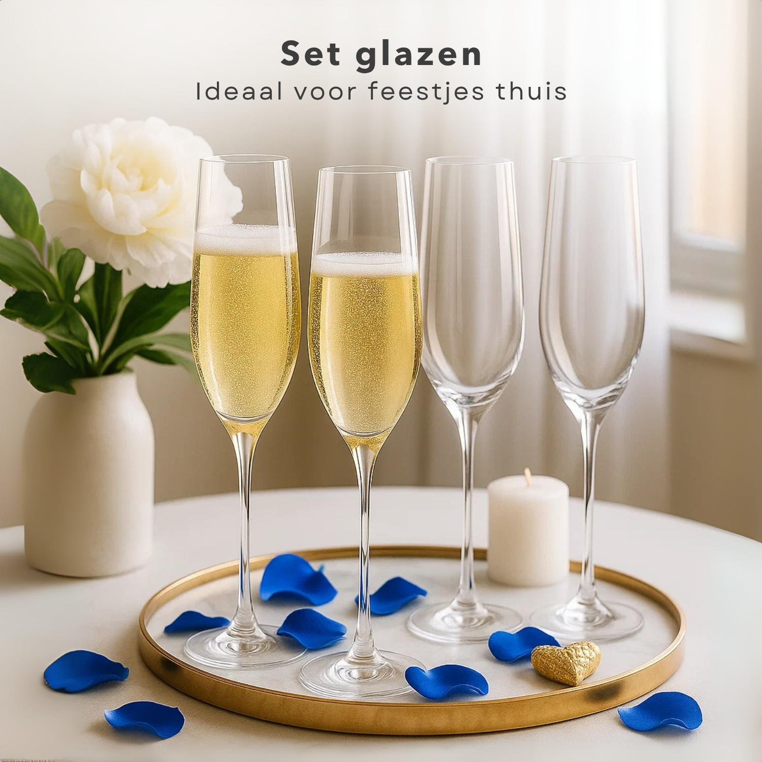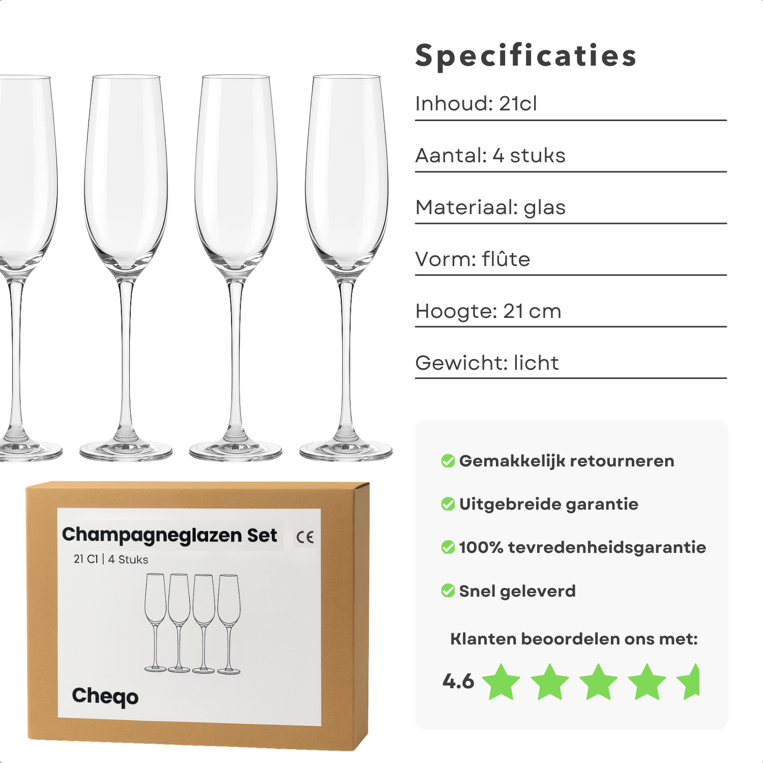 Cheqo® Champagneglazen Set - Champagneglas Set - Glazen Voor Champagne - Set Van 4 - Feestelijke Glazen - Hoogwaardige Kwaliteit - Elegant Design - Glaswerk Voor Feest - Luxe Uitstraling - Transparant Glas - Glazen Voor Bubbels