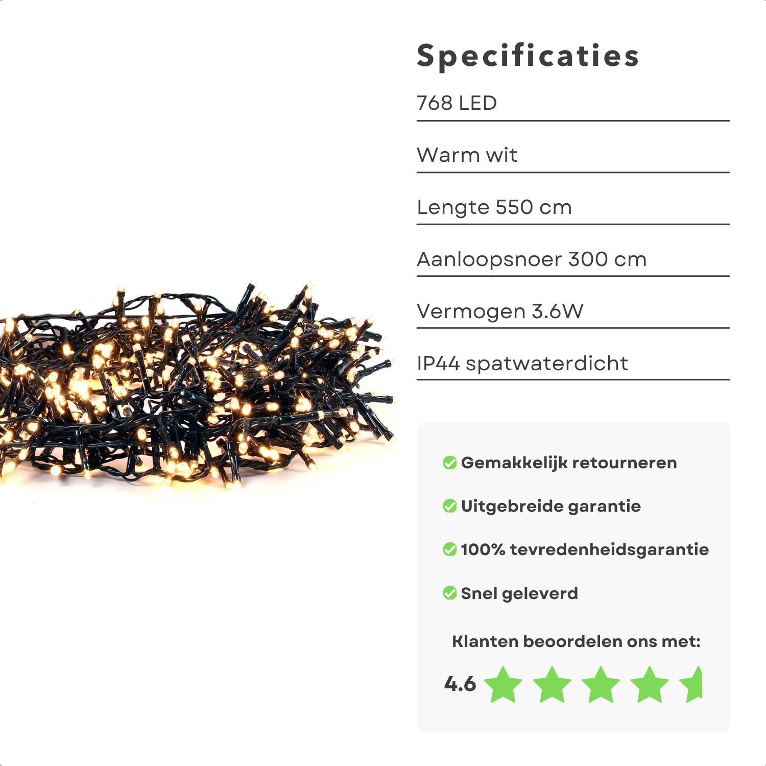 • Lang Aanloopsnoer: Met een aanloopsnoer van 300 cm heeft u voldoende lengte om de verlichting gemakkelijk aan te sluiten.