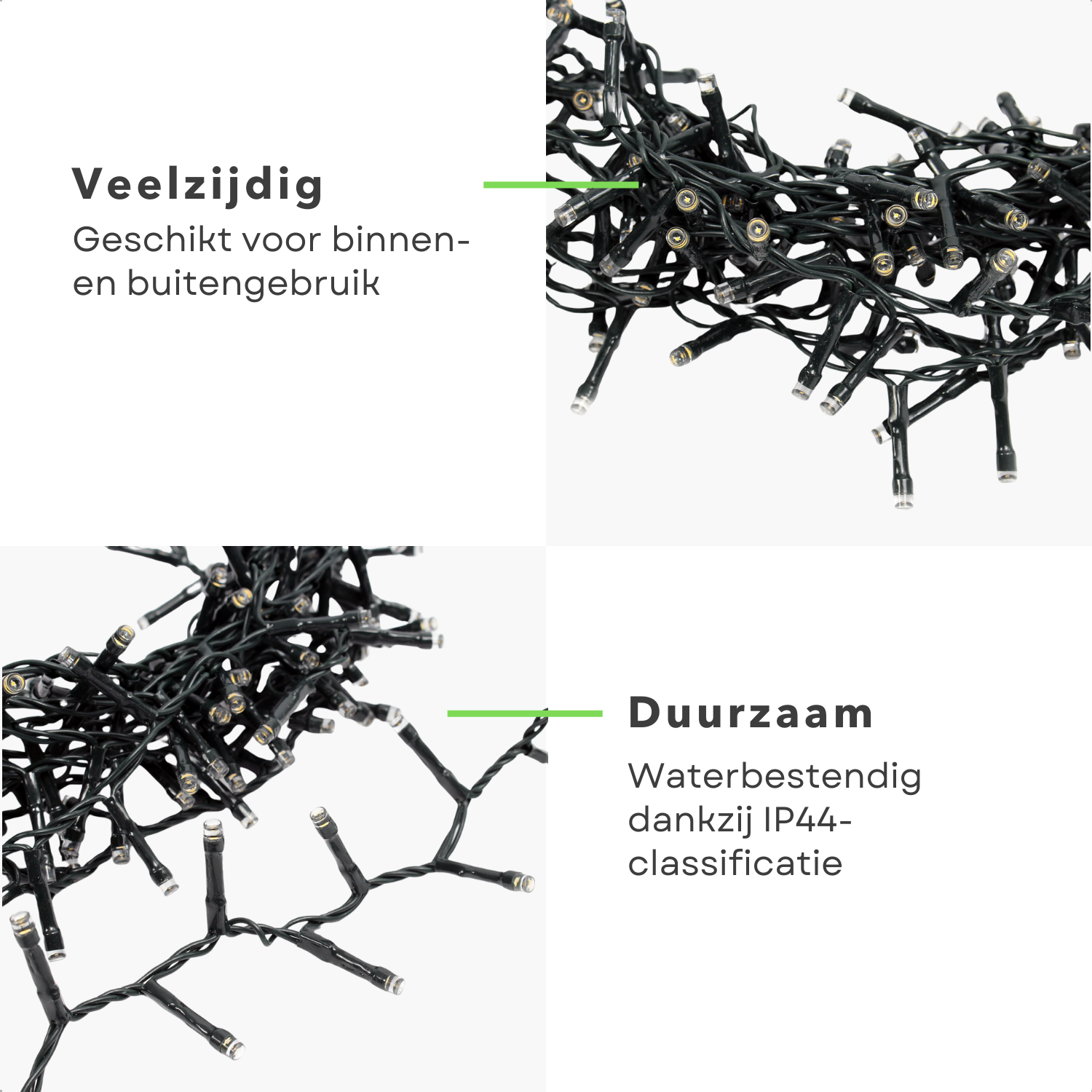 Deze clusterverlichting is ideaal voor het versieren van uw kerstboom, huis of tuin. De dichtheid van de lampjes zorgt voor een volle en rijke uitstraling, waardoor uw decoraties echt opvallen.