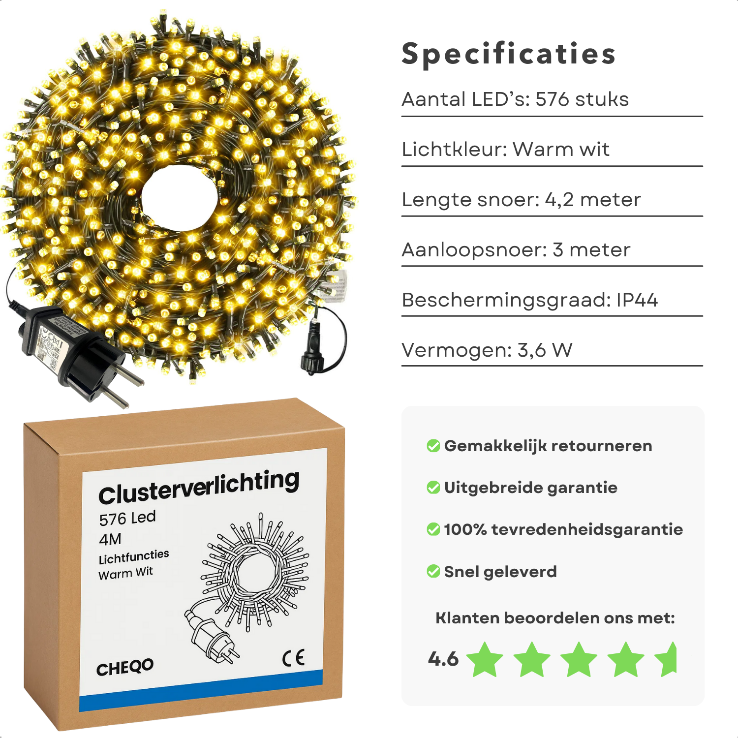 Cheqo® Clusterverlichting Warm Wit - 576 LED Lampjes - Lichtfuncties Met Geheugen - Energiezuinige LED's - Binnen En Buiten Gebruik - IP44 Beschermwaarde - Kerstboomverlichting - Kerstverlichting - Kerstlampjes