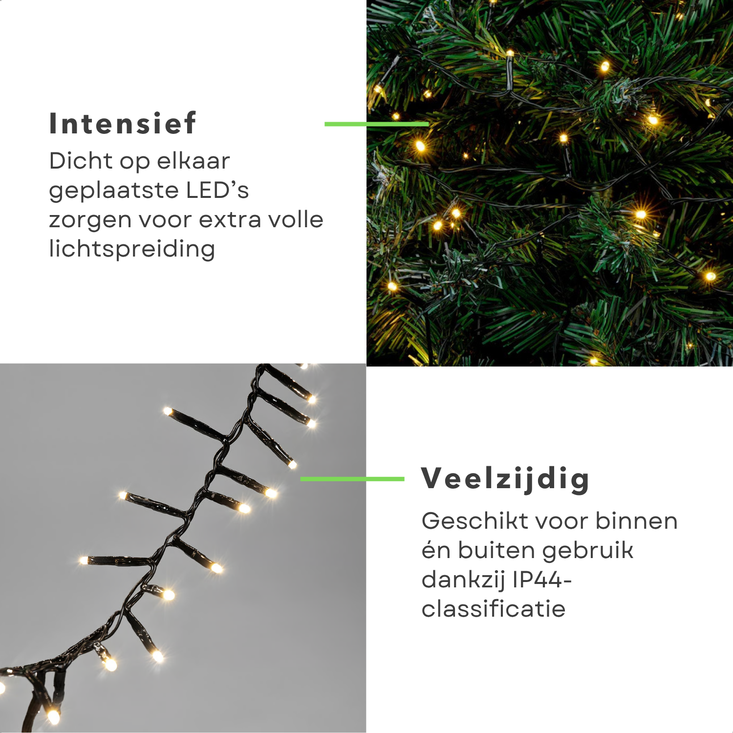 Versier je kerstboom, vensterbank, trapleuning of pergola met een zee van warm wit licht. De clusterlengte van 4.2 meter met een aanloopsnoer van 3 meter biedt flexibiliteit bij het plaatsen, terwijl het zwarte snoer subtiel wegvalt in het decor.