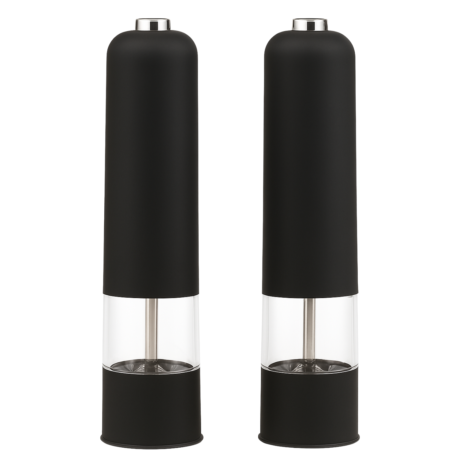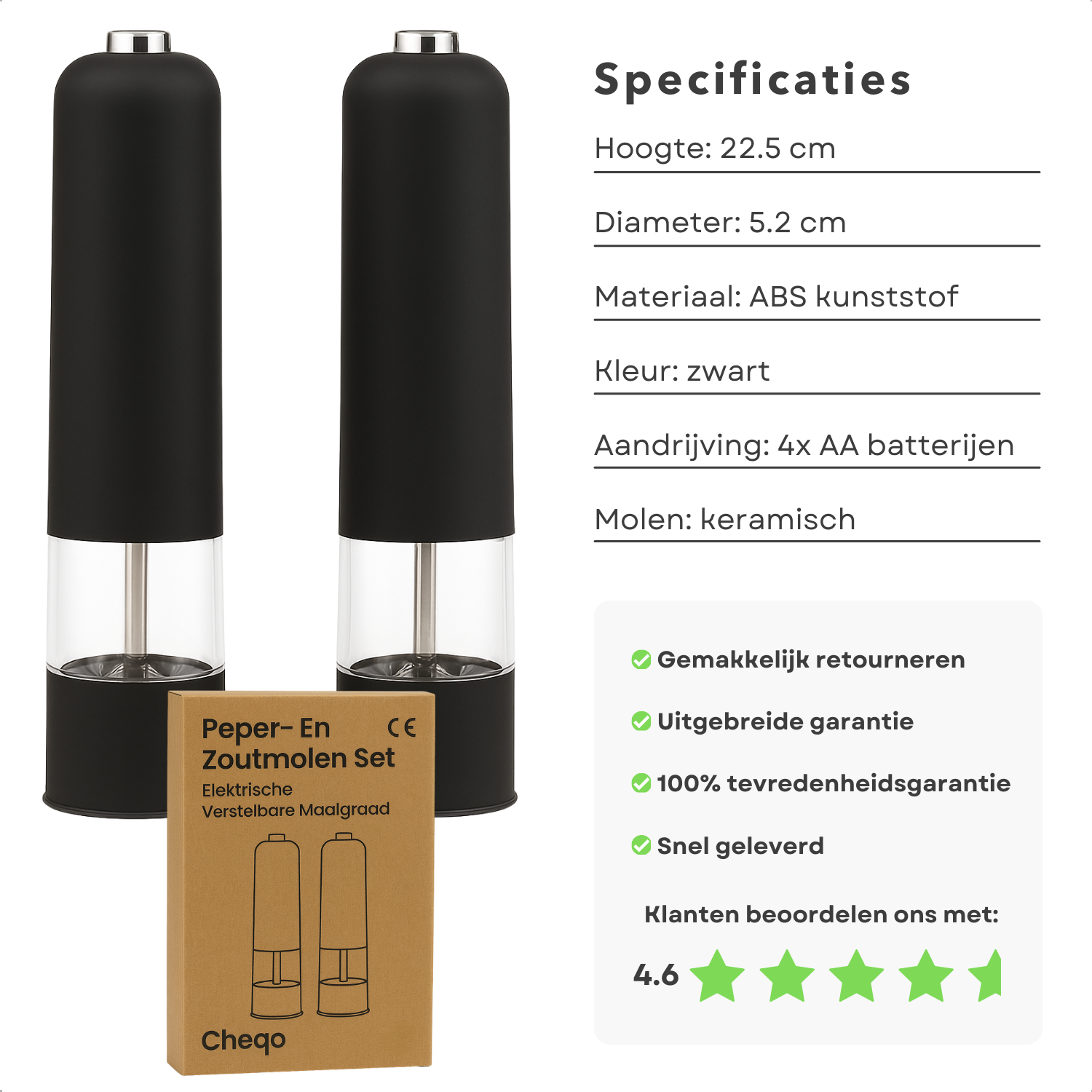 Cheqo® Elektrische Peper- En Zoutmolen - Zout & Pepermolen Stel Elektrisch - Verstelbare Maalgraad - Keramische Molen - Met Drukknop - Met Licht - Set Van 2 Stuks - ABS Kunststof - RVS Onderdelen - Zwart - Op Batterijen - Luxe Kwaliteit