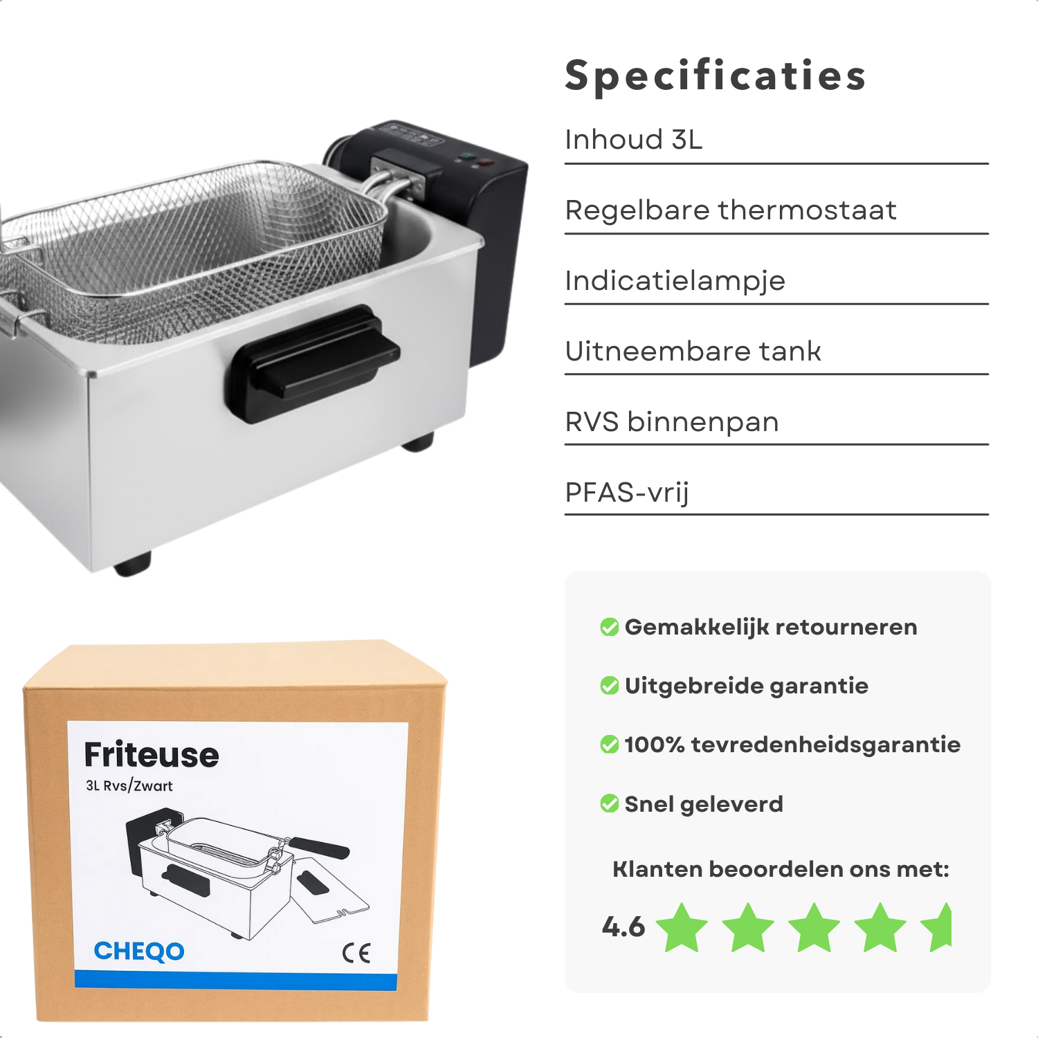 Cheqo® Friteuse - Regelbare Thermostaat - Indicatielampje - Uitneembare Tank - Verwarmingselement - PFAS-vrij - Eenvoudig Te Reinigen - RVS/Zwart - Functionele Friteuse - Frituurpan - Frituur Pan - Frietpan - Frituren