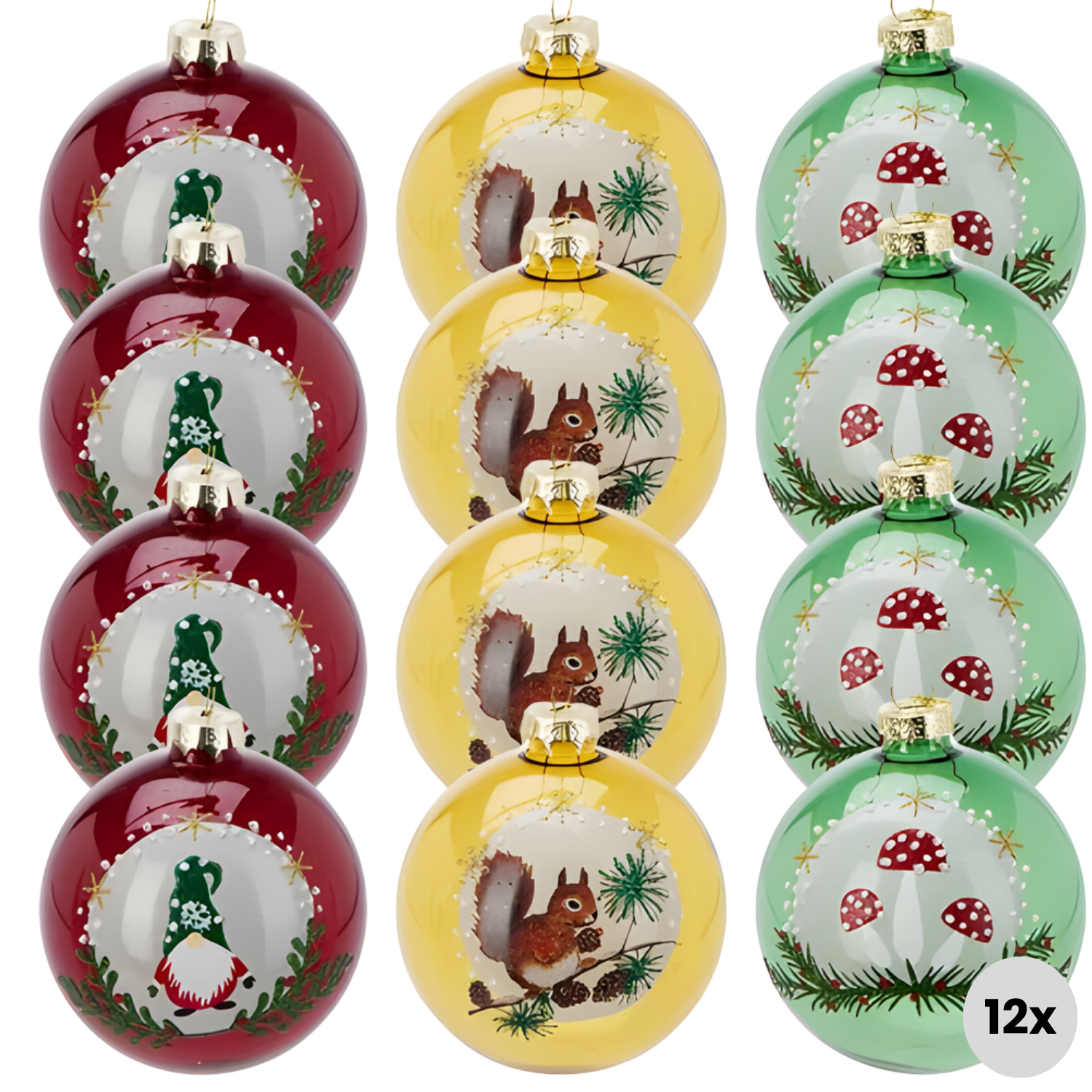 Cheqo® Glazen Kerstballen - Set Van 12 - Glanzend Kerstballen - Traditionele Kerstballen - Rode Kerstballen - Gele Kerstballen - Groene Kerstballen - Kerstboomversiering - Kerstdecoratie - Glazen Ornamenten - Kerstbal Set