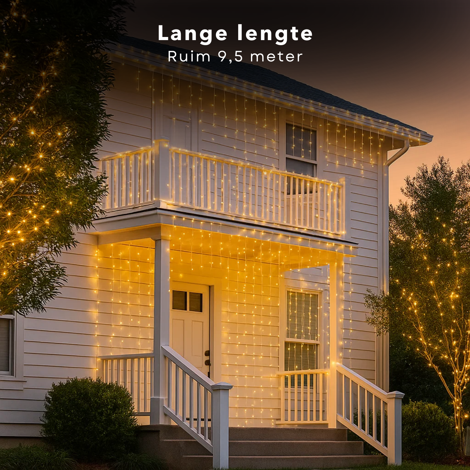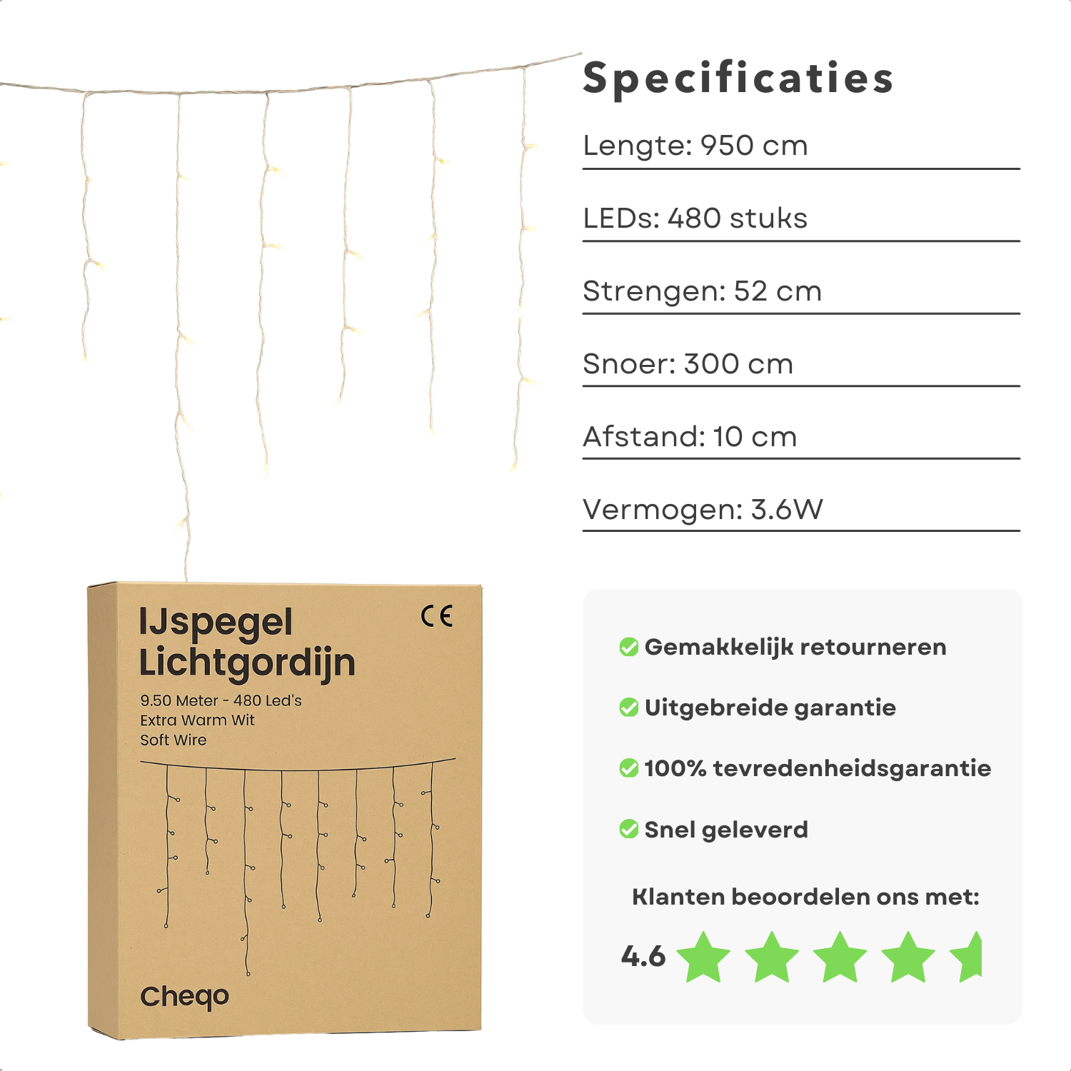 Cheqo® Ijspegel Lichtgordijn - 480 LED's - Extra Warm Wit - Lichtnet - Kerstverlichting Buiten - Binnen En Buiten - IP44 Spatwaterdicht - Energiezuinige LED's - 8 Lichtfuncties - 9.50 Meter - Groen Snoer - Lange En Korte Strengen