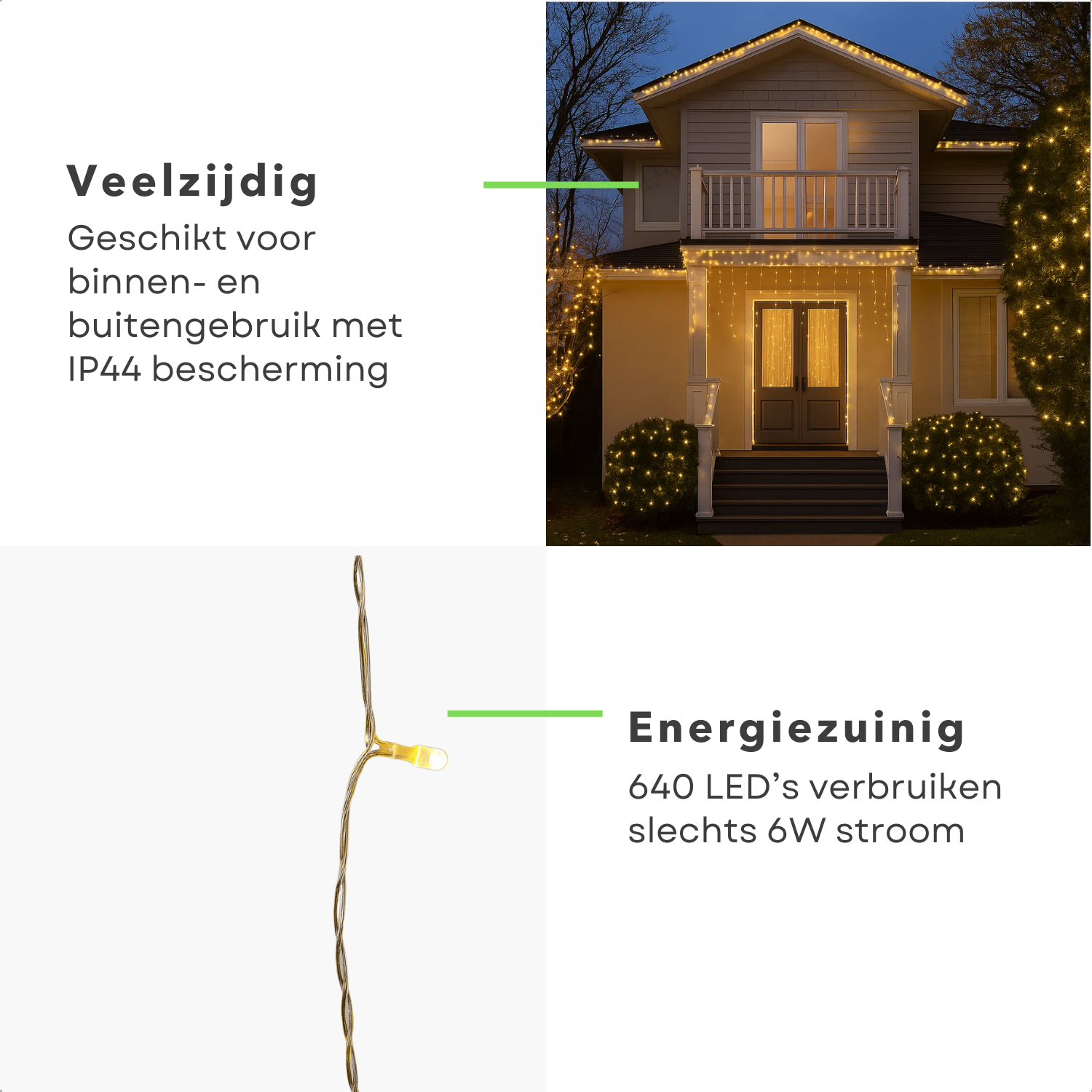 Cheqo® Ijspegel Lichtgordijn - Ijspegelverlichting Buiten - Kerstverlichting Buiten - Extra Warm Wit - 640 LED Lampjes - 12.70 Meter - Lichtgordijn Binnen En Buiten - IP44 Spatwaterdicht - Energiezuinige LED's - 8 Lichtfuncties - Groen Snoer