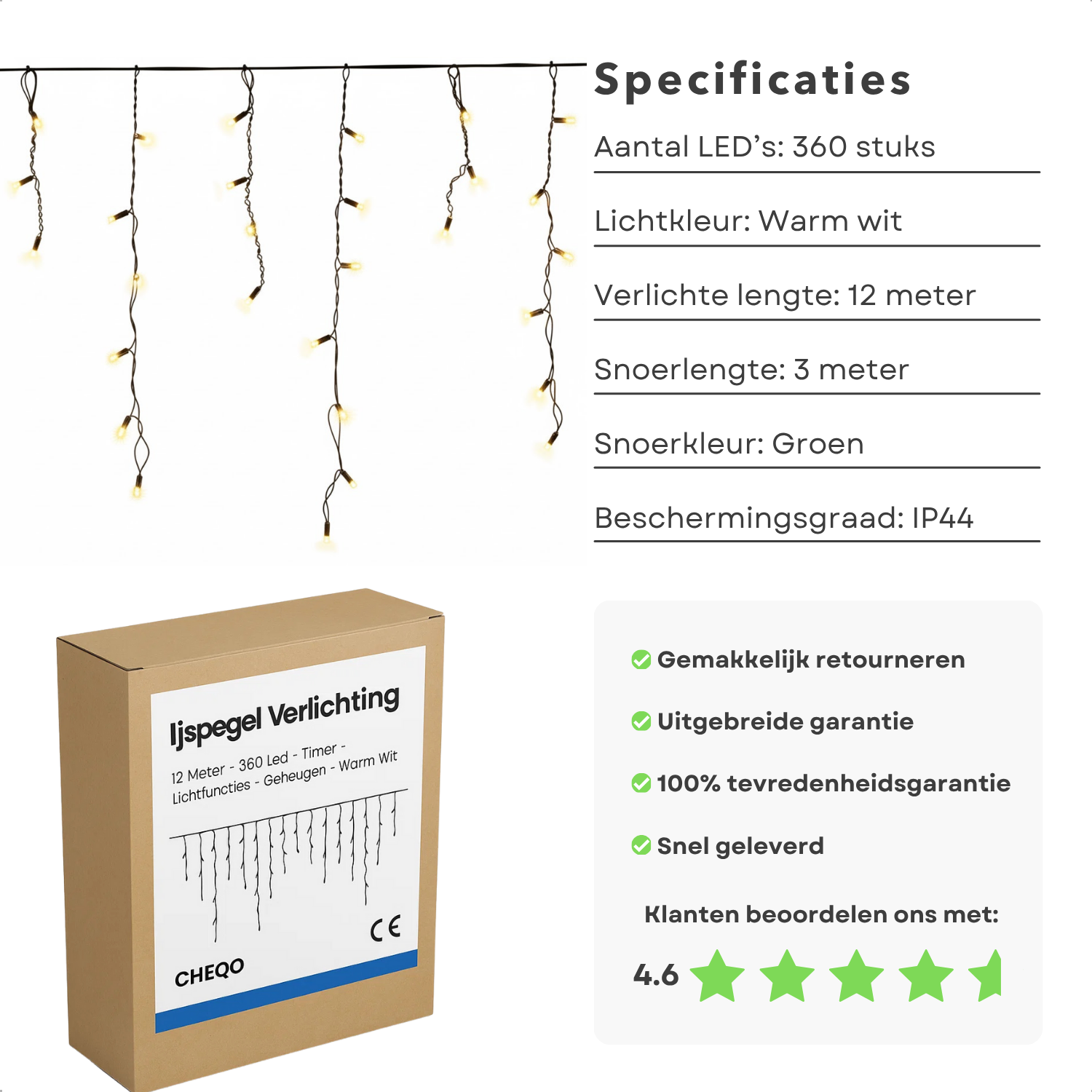 Cheqo® Ijspegel Verlichting - Ijspegelverlichting Buiten - 12 Meter - 360 LED - Warm Wit - Timer Functie - Lichtfuncties - Lichtnet - Kerstlampjes Met Geheugen - IP44 - Buiten Kerstverlichting - Verlichte Lengte