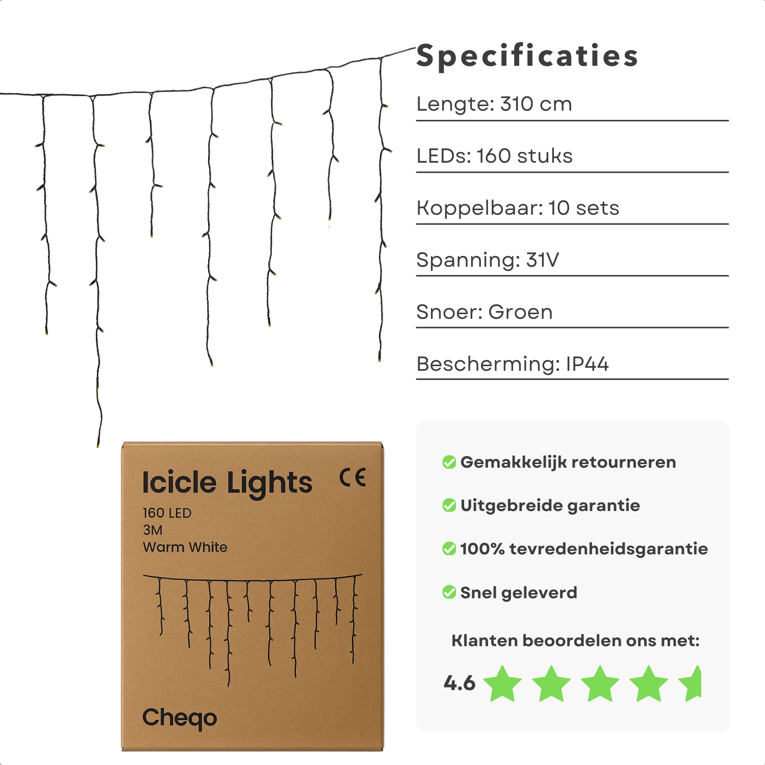 Cheqo® IJspegel Verlichting - IJspegelverlichting Buiten - Kerstverlichting Buiten - Extra Warm Wit - 160 LED’s - Koppelbare Verlichting - IP44 Beschermwaarde - Groen Snoer - Verlengset - Binnen En Buiten Geschikt - Lichtgordijn - 31V Koppelbaar