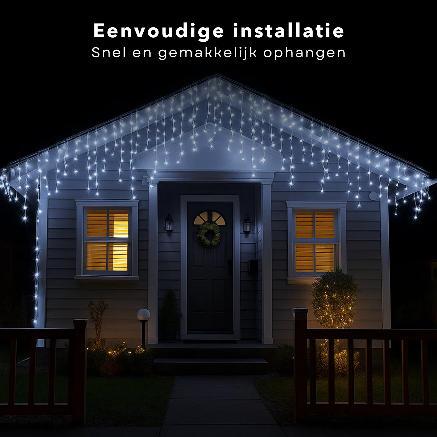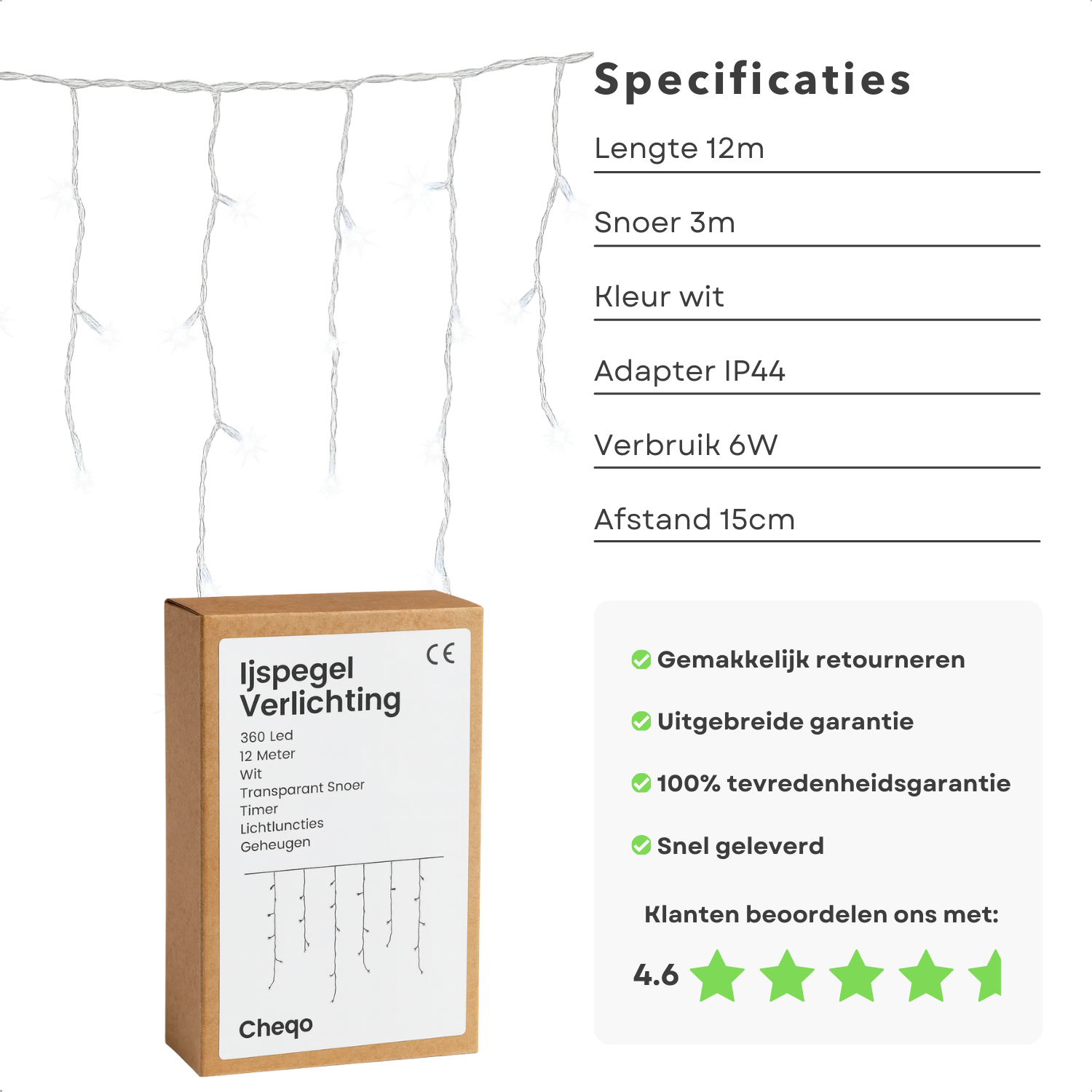 Cheqo® Ijspegel Verlichting - Kerstverlichting Buiten - Lichtnet - Ijspegelverlichting 360 LED - Wit Licht - Koelwit - Transparant Snoer - 12 Meter Lengte - IP44 Adapter - Geschikt voor Buiten - met Timer - 8 Lichtfuncties met Geheugen