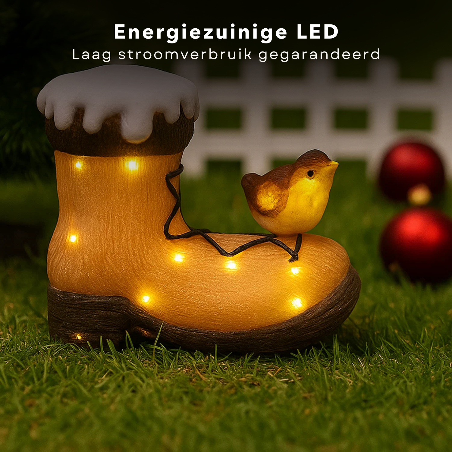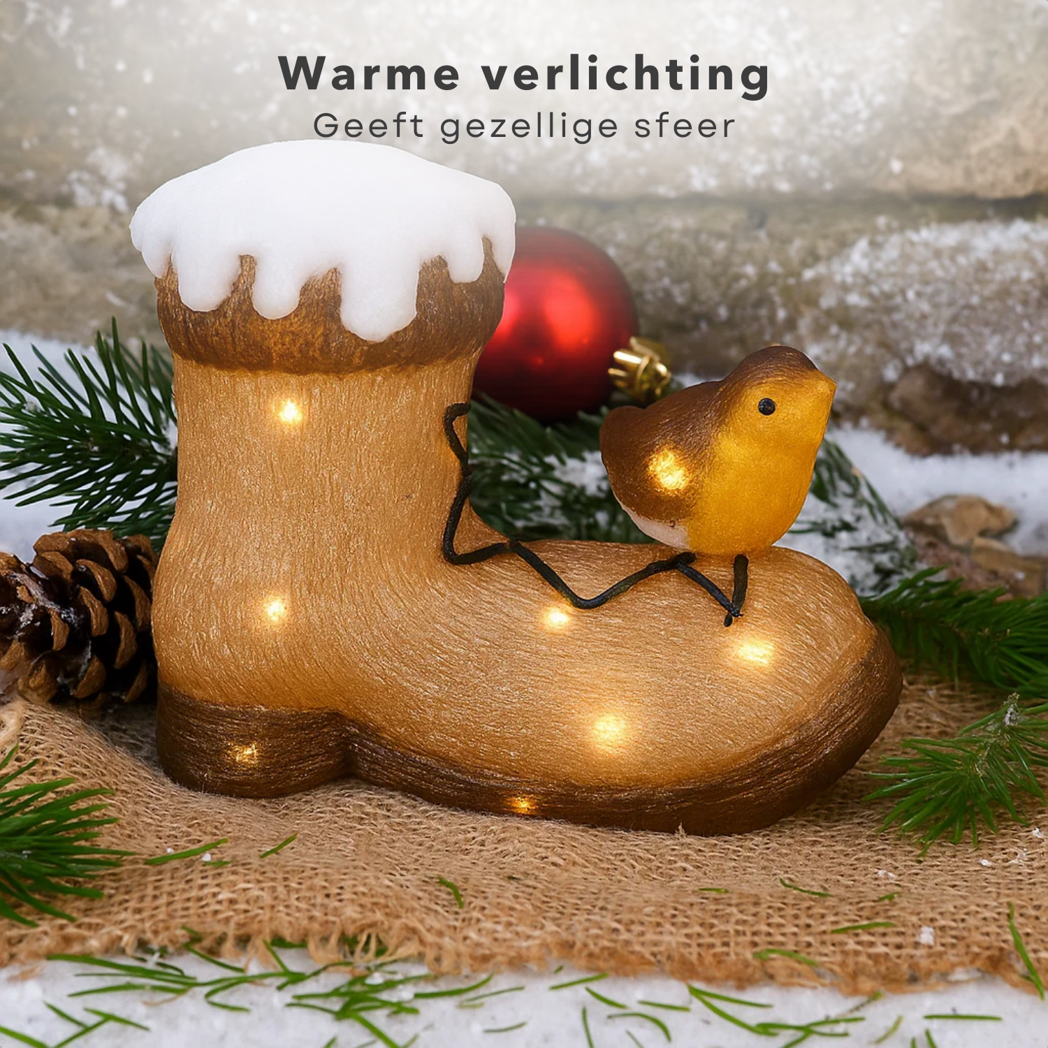 Cheqo® Verlicht Kerstfiguur Acryl - Vogel Op Laars - LED Verlichting - Kerstversiering - Acryl Materiaal - Werkt Op Batterijen - Binnen En Buiten - Timerfunctie - IP44 Batterijbox - Verlicht Kerstfiguur - Decoratieve Verlichting