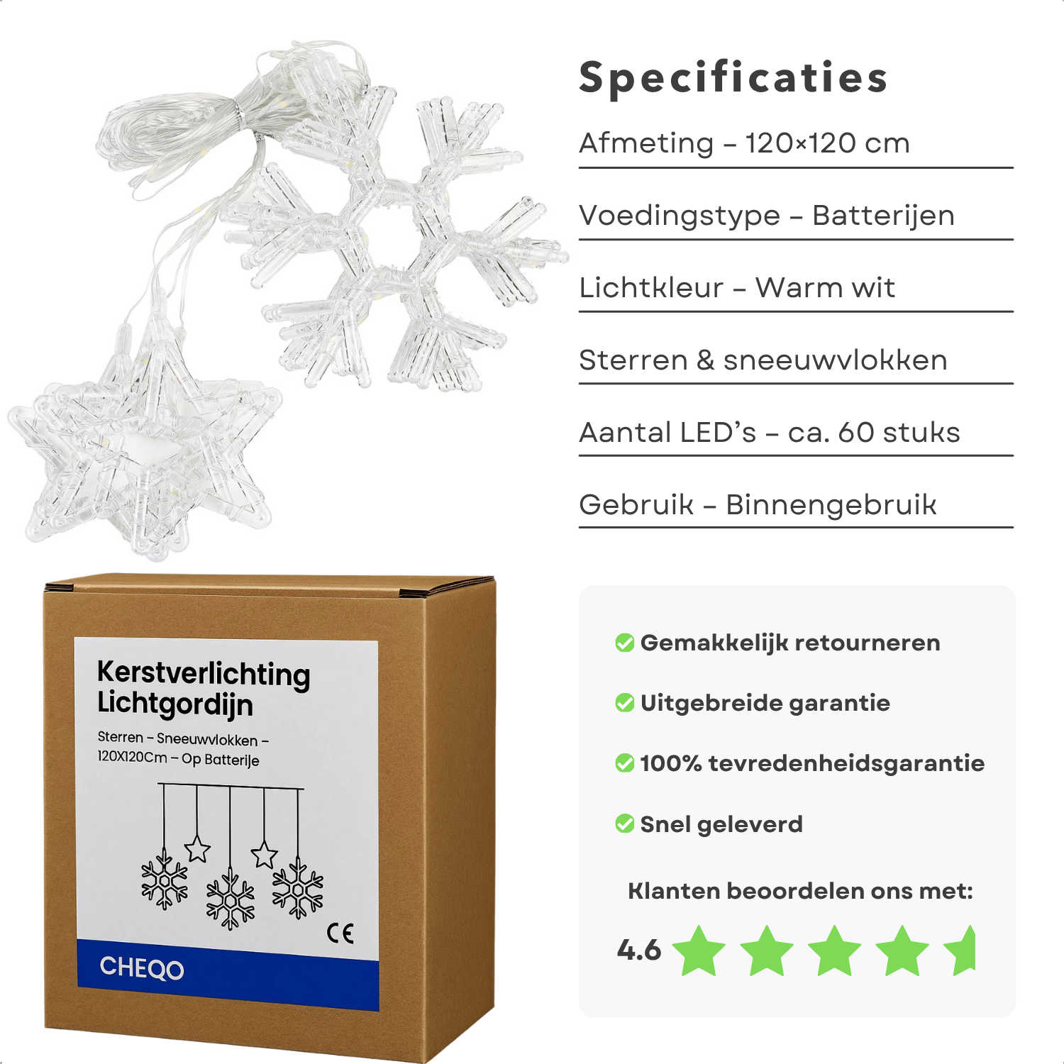 Cheqo® Kerstverlichting Lichtgordijn - Sterren En Sneeuwvlokken - 120x120 cm - Op Batterijen - Warm Wit Licht - 120 Micro LED - Automatische Timer - 8 Lichtfuncties - IP44 - Buiten En Binnen Gebruik - Kerstdecoratie - Lichtnet