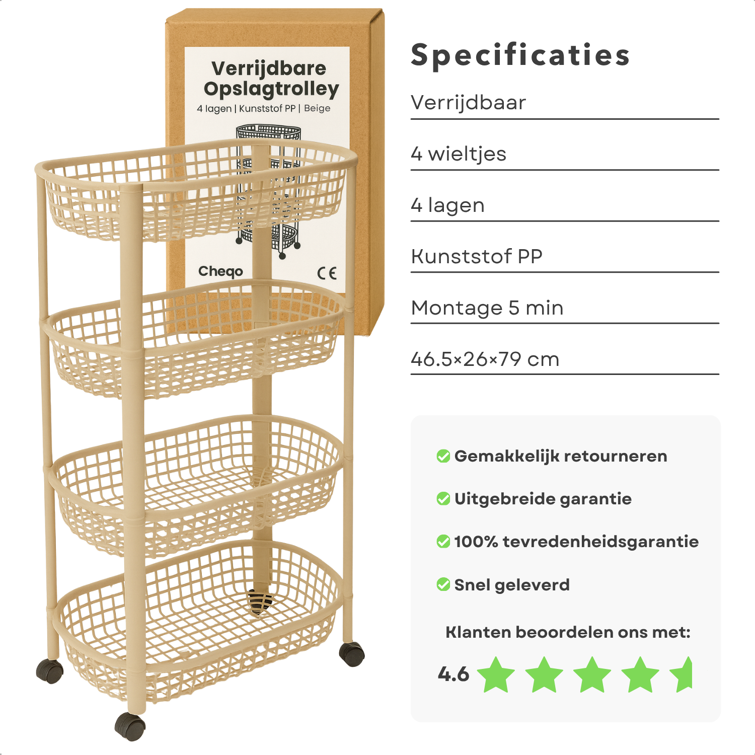 Cheqo® Keukentrolley Op Wielen - Verrijdbare Keukentrolley - 4 Lagen Trolley - Kunststof Trolley - Beige Keukentrolley - Opbergtrolley Met Manden - Keuken Opbergoplossing - Compacte Keukentrolley - Keuken Organizer - Badkamer Organizer