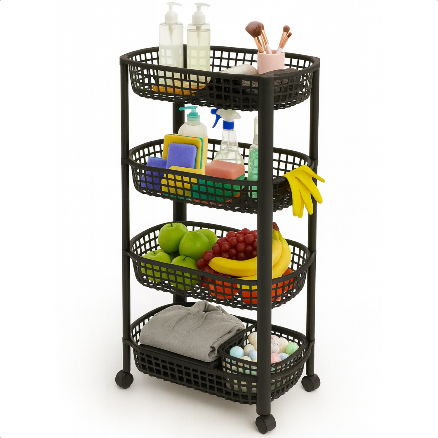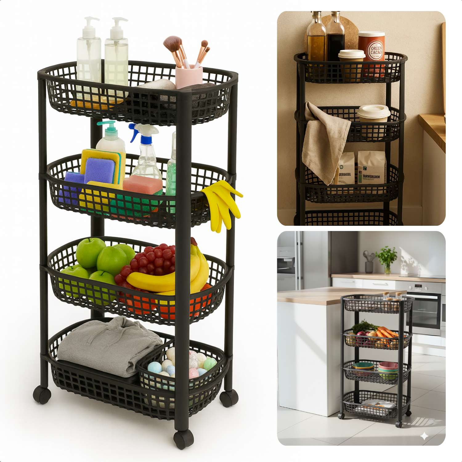 • 4 Lagen Met Manden: Vier open, geventileerde manden houden inhoud zichtbaar en luchtig, ideaal voor etenswaren en accessoires.