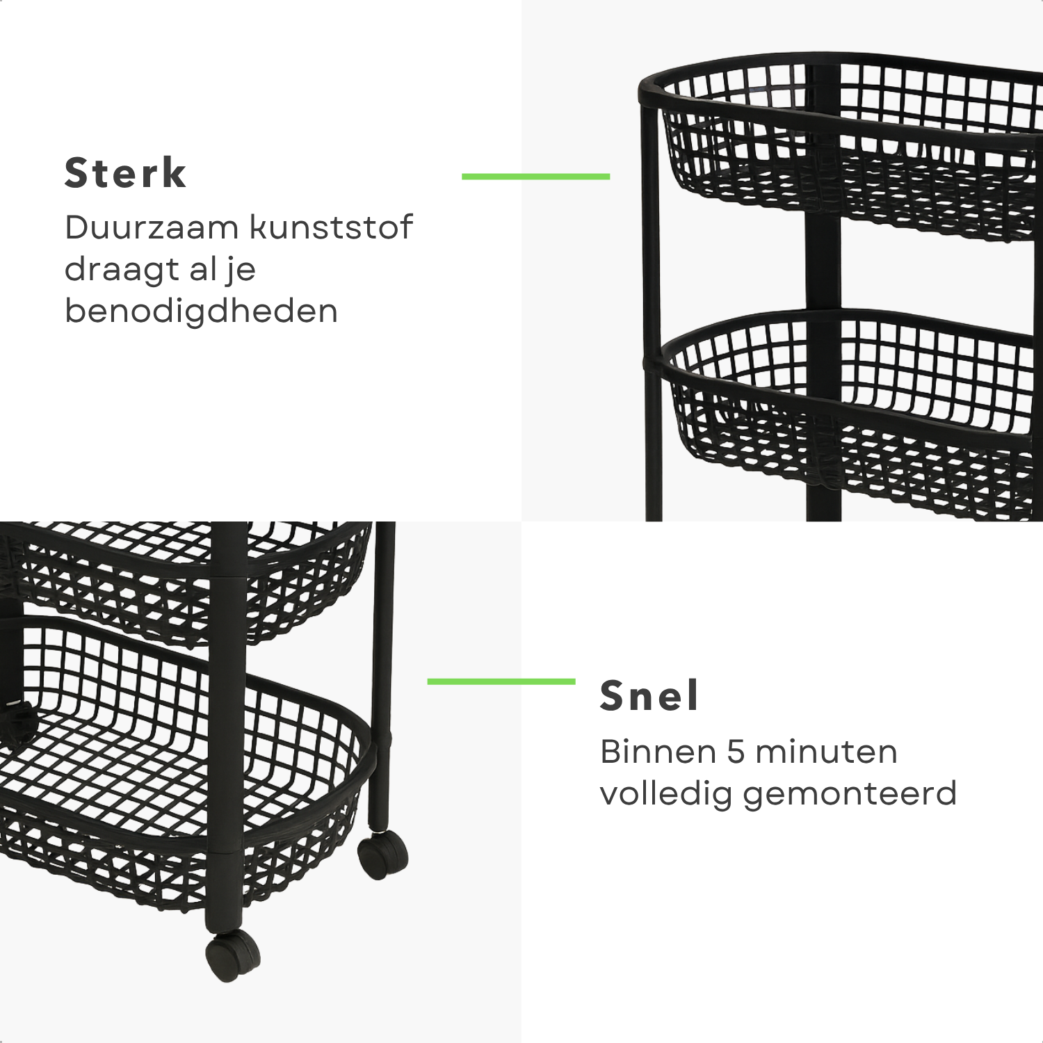 Houd je keuken strak georganiseerd met de Cheqo keukentrolley op wieltjes. Deze compacte, zwarte trolley biedt 4 lagen met open manden voor direct overzicht en snelle toegang. Dankzij het lichte, stevige kunststof (PP) en vier wieltjes verplaats je hem moeiteloos door huis. Met zijn smalle formaat (46.5 x 26 x 79 cm) past hij perfect naast een keukenkast, koelkast of in een nis. Monteer hem in enkele minuten en gebruik hem voor groente en fruit, schoonmaakspullen, servies of voorraad.
