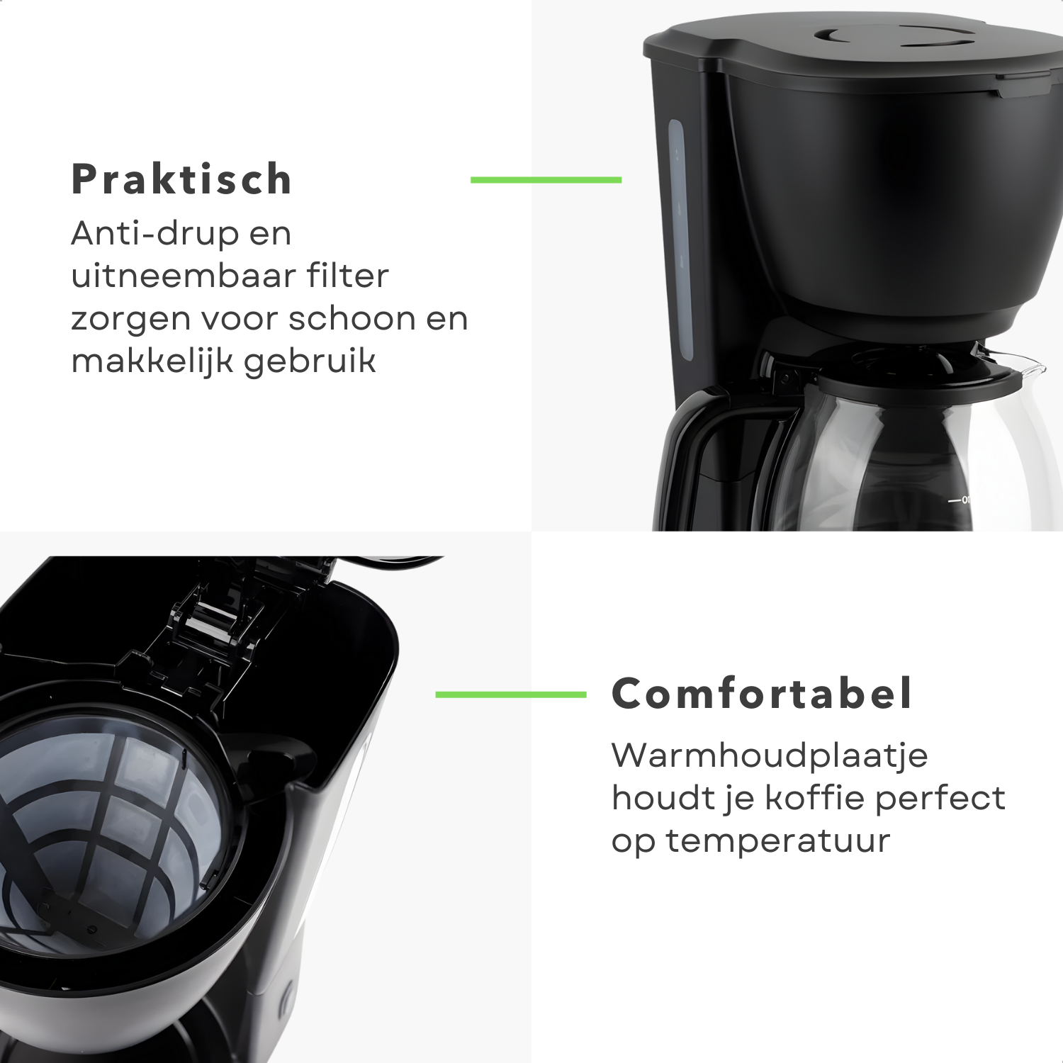 Cheqo® Koffiezetapparaat met Glazen Kan - Uitneembaar Filter - Anti-Drup Functie - Koffiezet Apparaat - Filterkoffie Machine - Warmhoudplaatje - Koffiemachine - Zwart Koffiezetapparaat - Betrouwbare Koffiemachine
