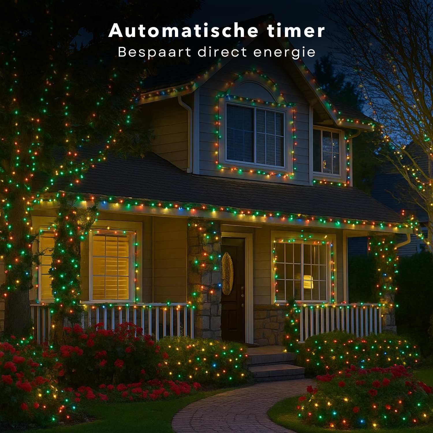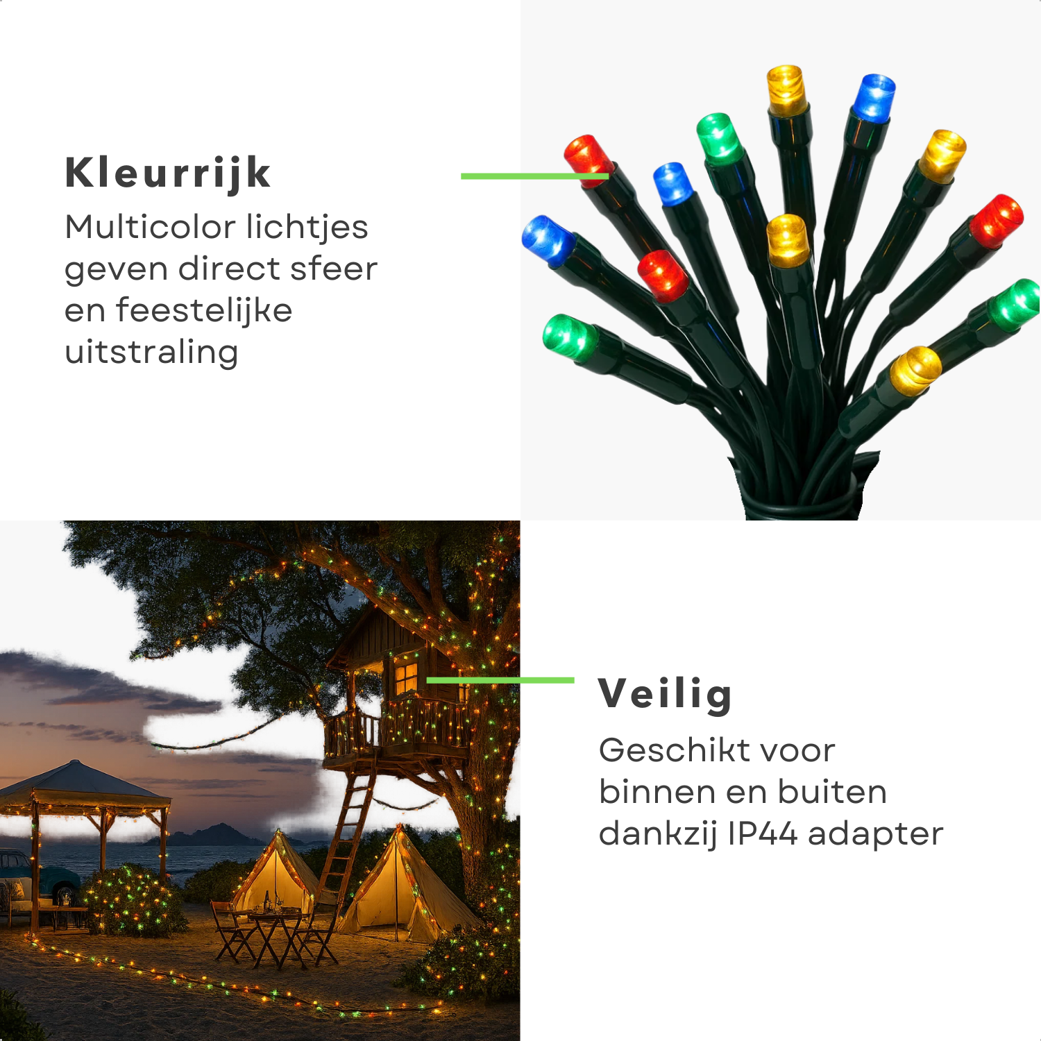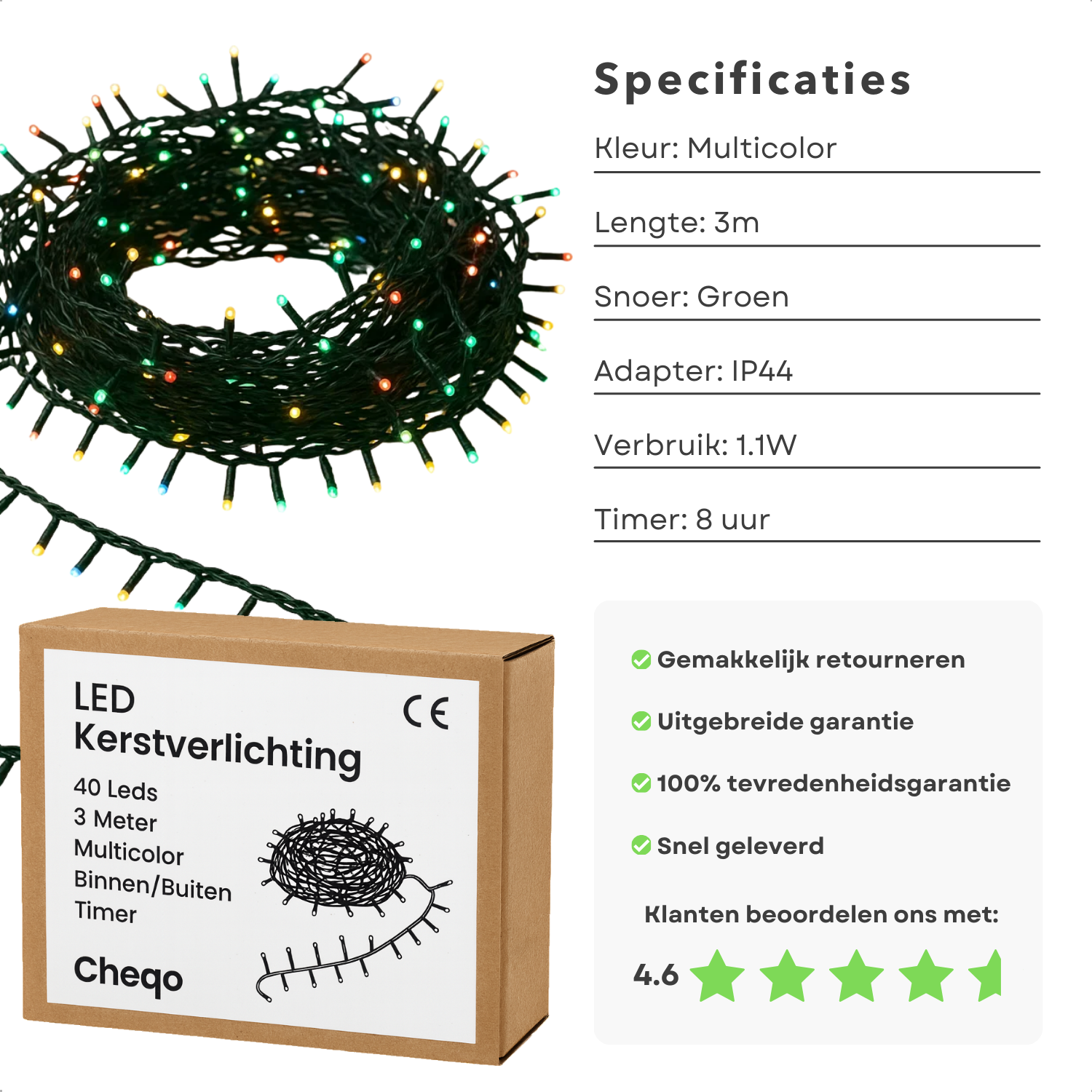 Cheqo® LED Kerstverlichting - Kerstlampjes - Kerstboomverlichting 40 LED - 3 Meter Snoer - Multicolor Verlichting - Binnen en Buiten - 8 Lichtfuncties - Multicolor - IP44 Adapter - Geheugenfunctie - Timer 8 Uur aan - Groen Snoer