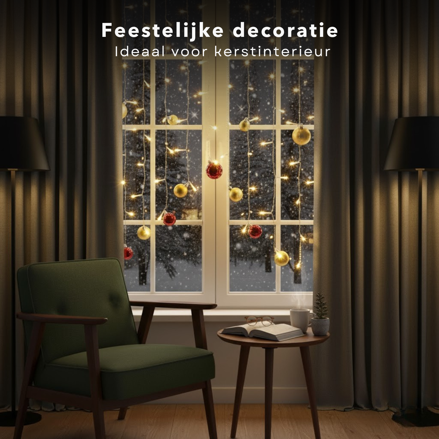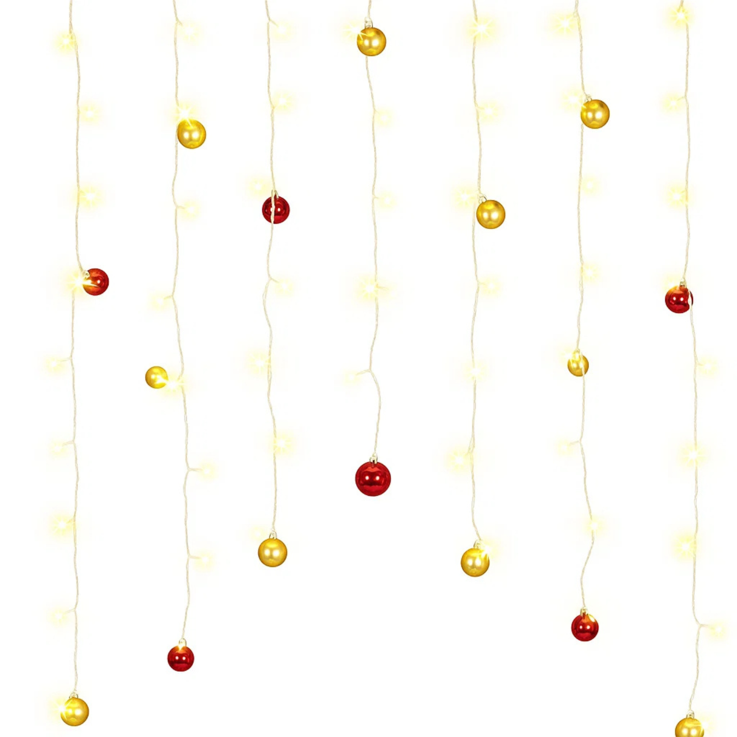 Cheqo® Lichtgordijn Kerstballen - Kerstverlichting Op Batterijen - Warm Wit Licht - 74 LED Lampjes - Automatische Timer - IP-44 - Buiten Geschikt - Kerstdecoratie Binnen - Kerstdecoratie Buiten - Sfeer Verlichting - Lichtnet - Licht Gordijn