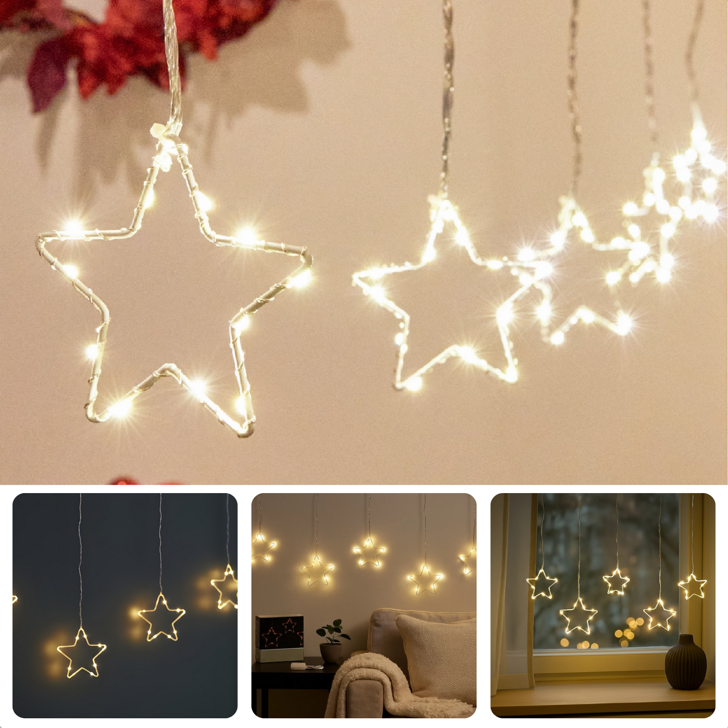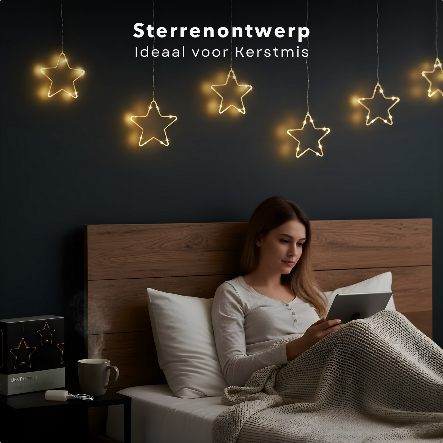 • Lichtgordijn met kerststerren: Stervormige verlichting voor een feestelijke, decoratieve look in huis.
