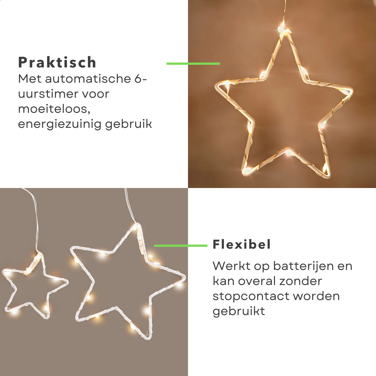 Cheqo® Lichtgordijn Kerststerren - Kerst Lichtgordijn - Licht Gordijn - Warm Wit Licht - 45 LED Lampjes - Automatische Timer - Kerst Ster Verlichting - Kerstverlichting Op Batterijen - Kerstlampjes - Kerstdecoratie - Kertster Verlichting