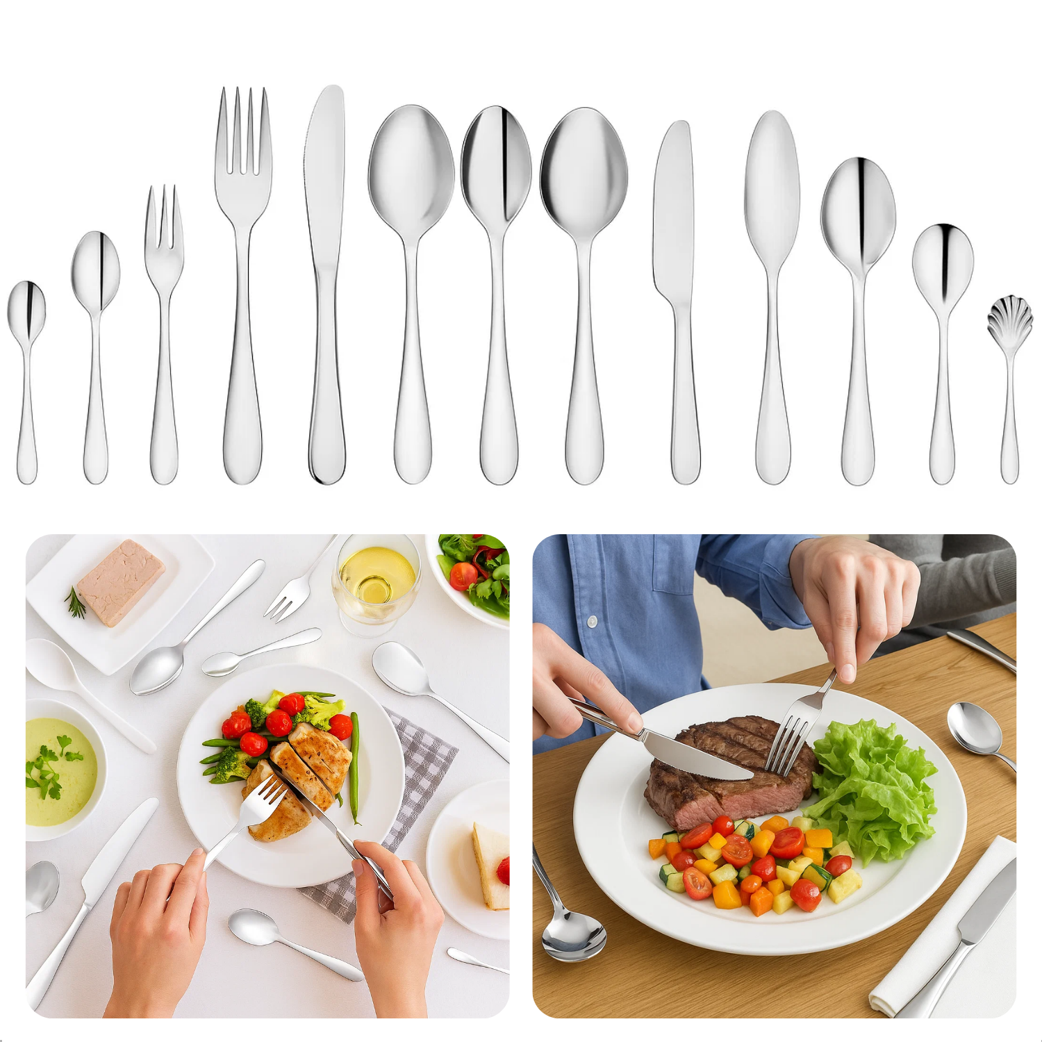Cheqo® Luxe Bestekset - 70-Delig - Voor 12 Personen - RVS Bestek - Zilverkleurig - Vaatwasserbestendig - Hoogwaardig Edelstaal - Tijdloos Design - Serveerbestek Inbegrepen - 12 Lepels - 12 Vorken - 12 Messen - 12 Theelepels - 12 Taartvorkjes