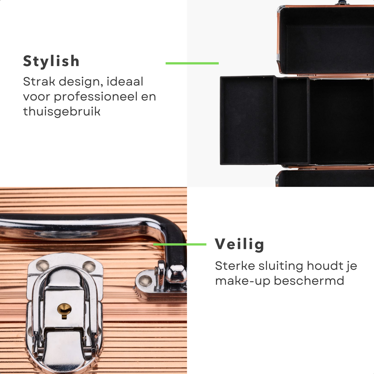 • Hoeveel vakken heeft de koffer?: De koffer heeft meerdere verstelbare vakken voor optimale organisatie.