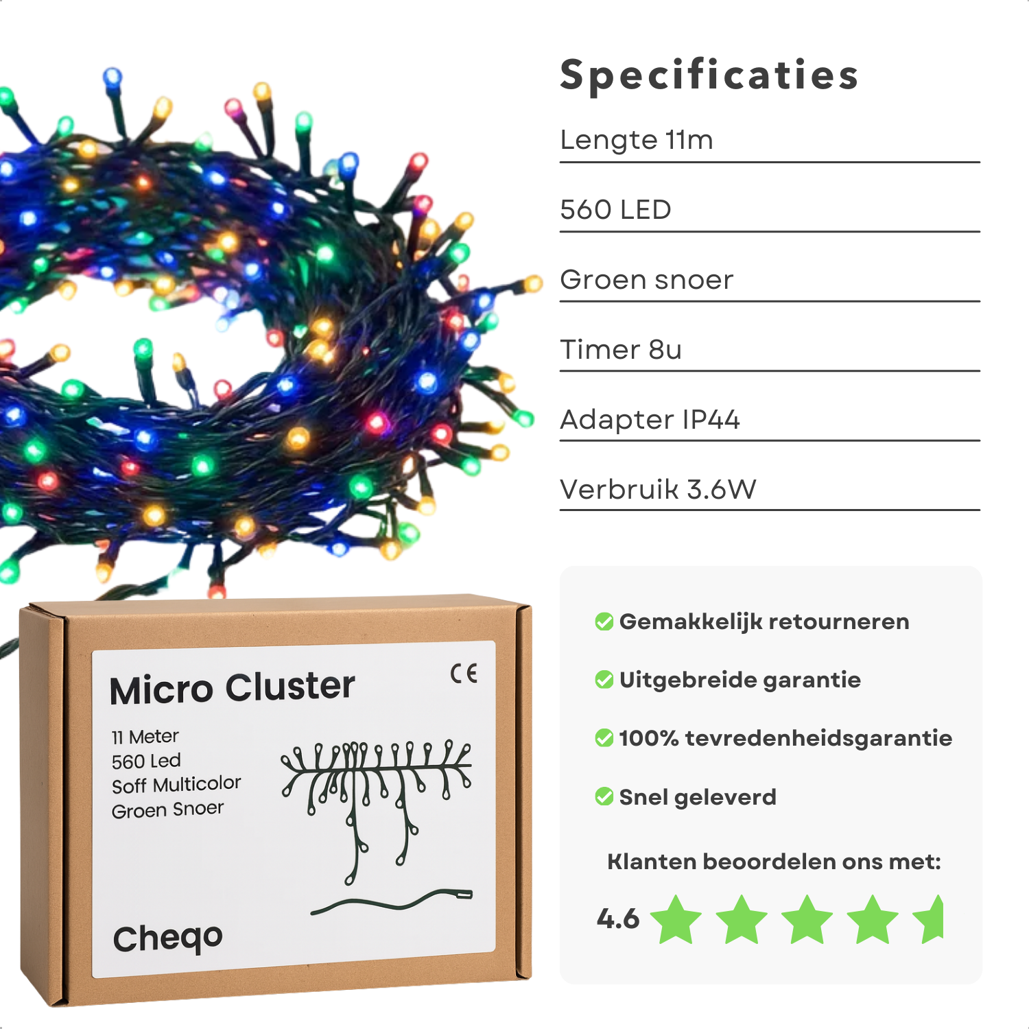 Cheqo® Microcluster Kerstverlichting - Kerstlampjes - Kerstboomverlichting - 560 LED Lampjes - Soft Multi Colour - Veelkleurige Verlichting - 8 Lichtfuncties - Geheugenfunctie - Timer 8 Uur - 11 Meter Lengte - Geschikt voor 180 CM Kerstboom
