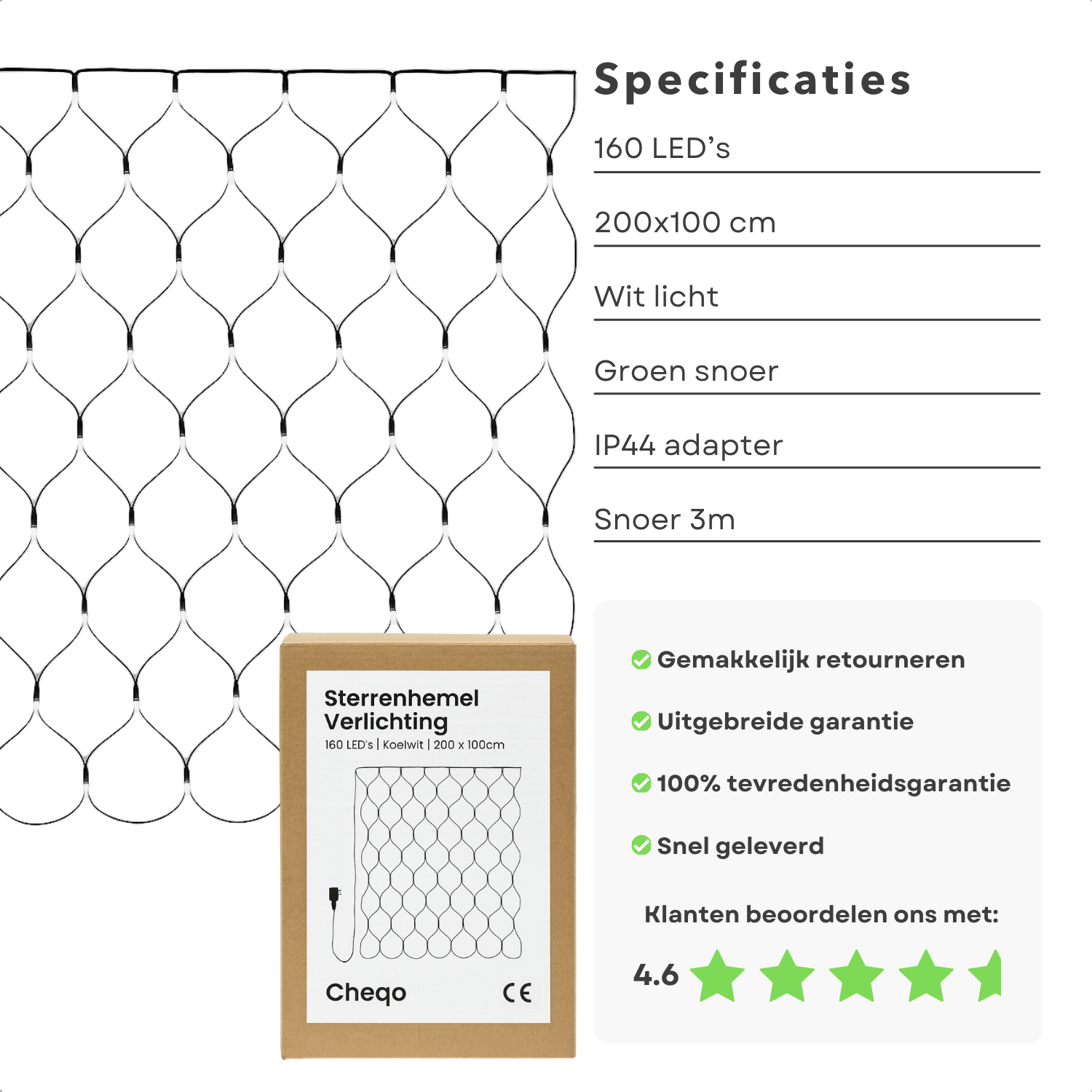 Cheqo® Netverlichting Buiten - Kerstverlichting Buiten - Kerstlampjes 160 LED Lampjes - IP44 Adapter - Koelwit Licht - Groen Snoer - 200x100 CM - Lichtnet Kerstverlichting - Tuinverlichting - Struikverlichting - Sterrenhemel Effect - Lichttapijt