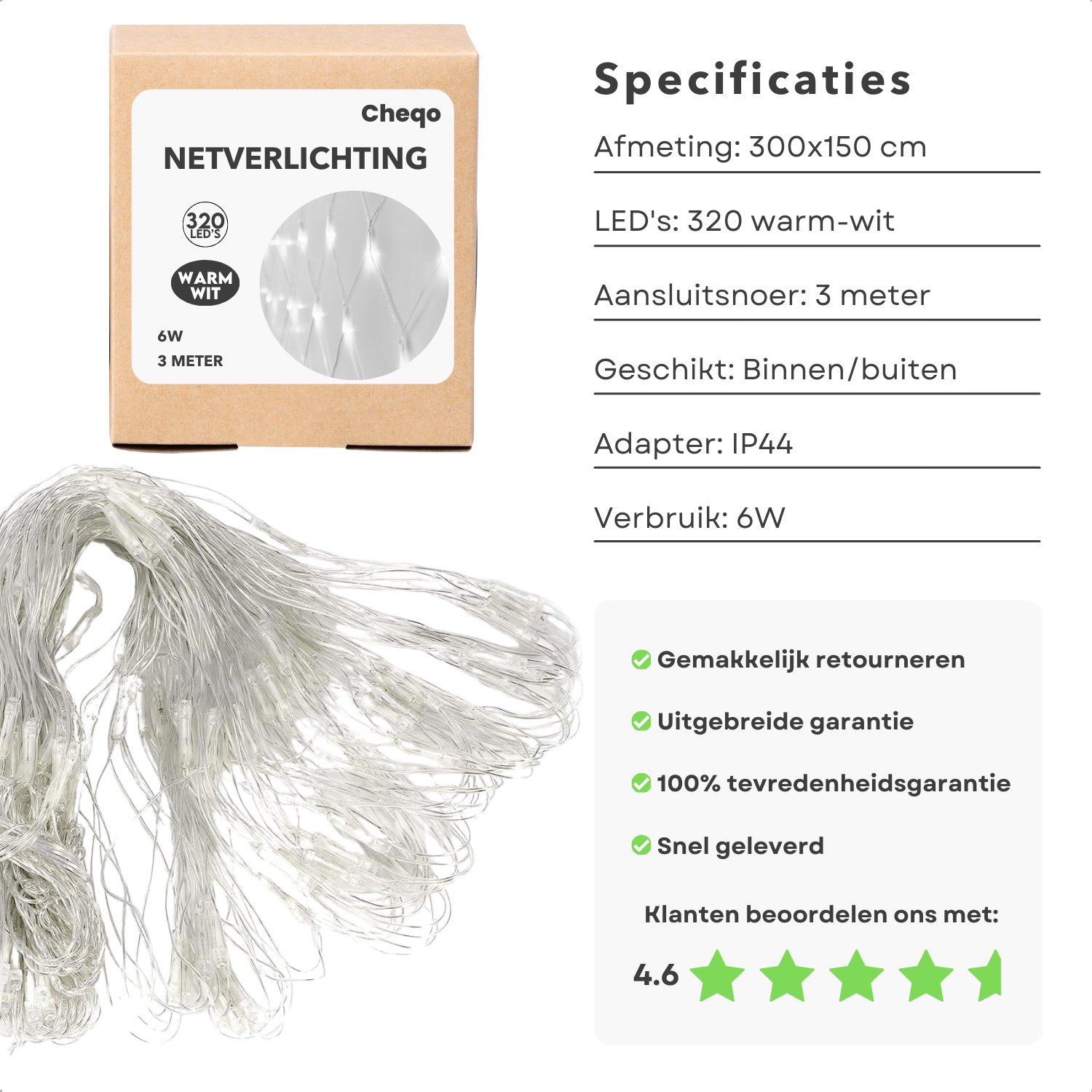 Cheqo® Netverlichting LED - Lichtgordijn - Lichtnet voor Buiten - Kerstverlichting - Kerstlampjes - Warm Wit 320 Lampjes - 300x150 cm - Buitenverlichting IP44