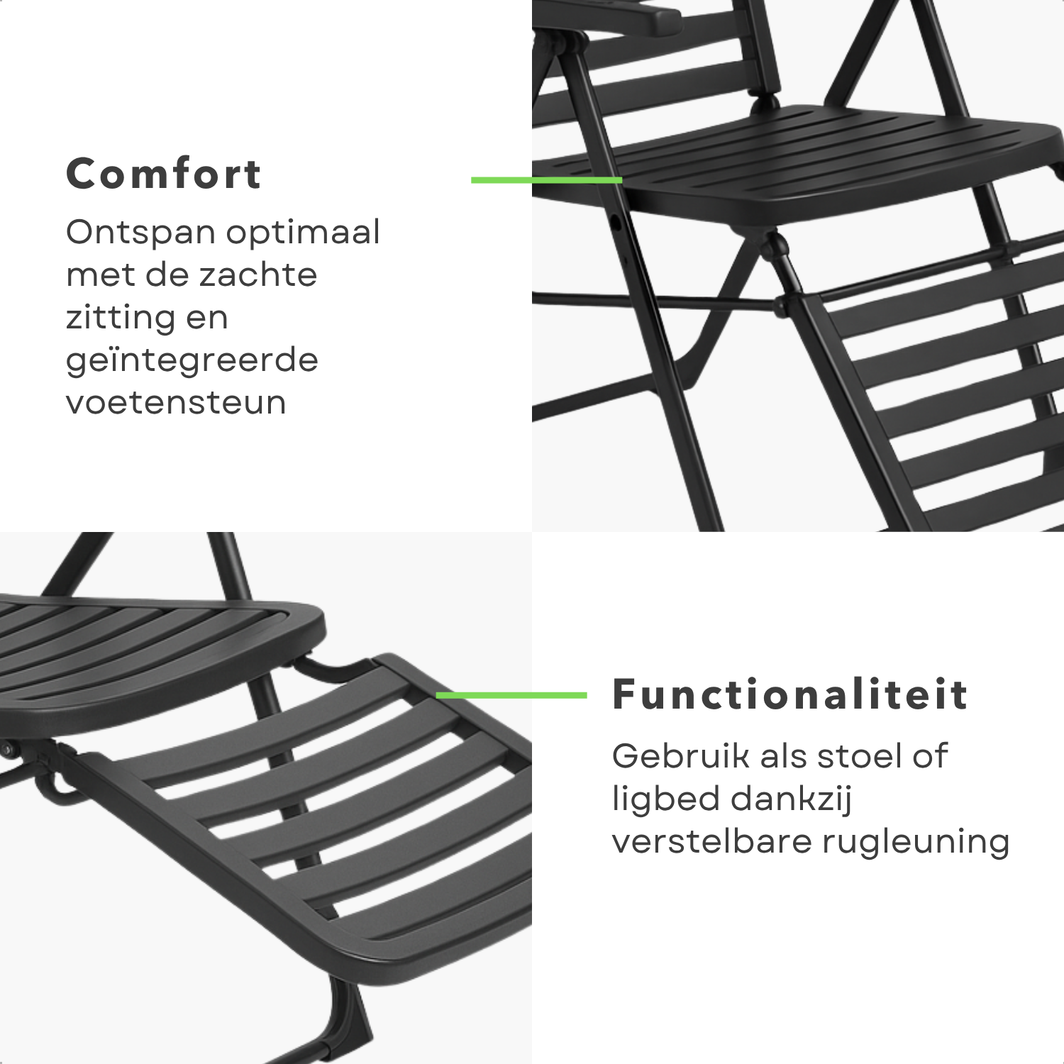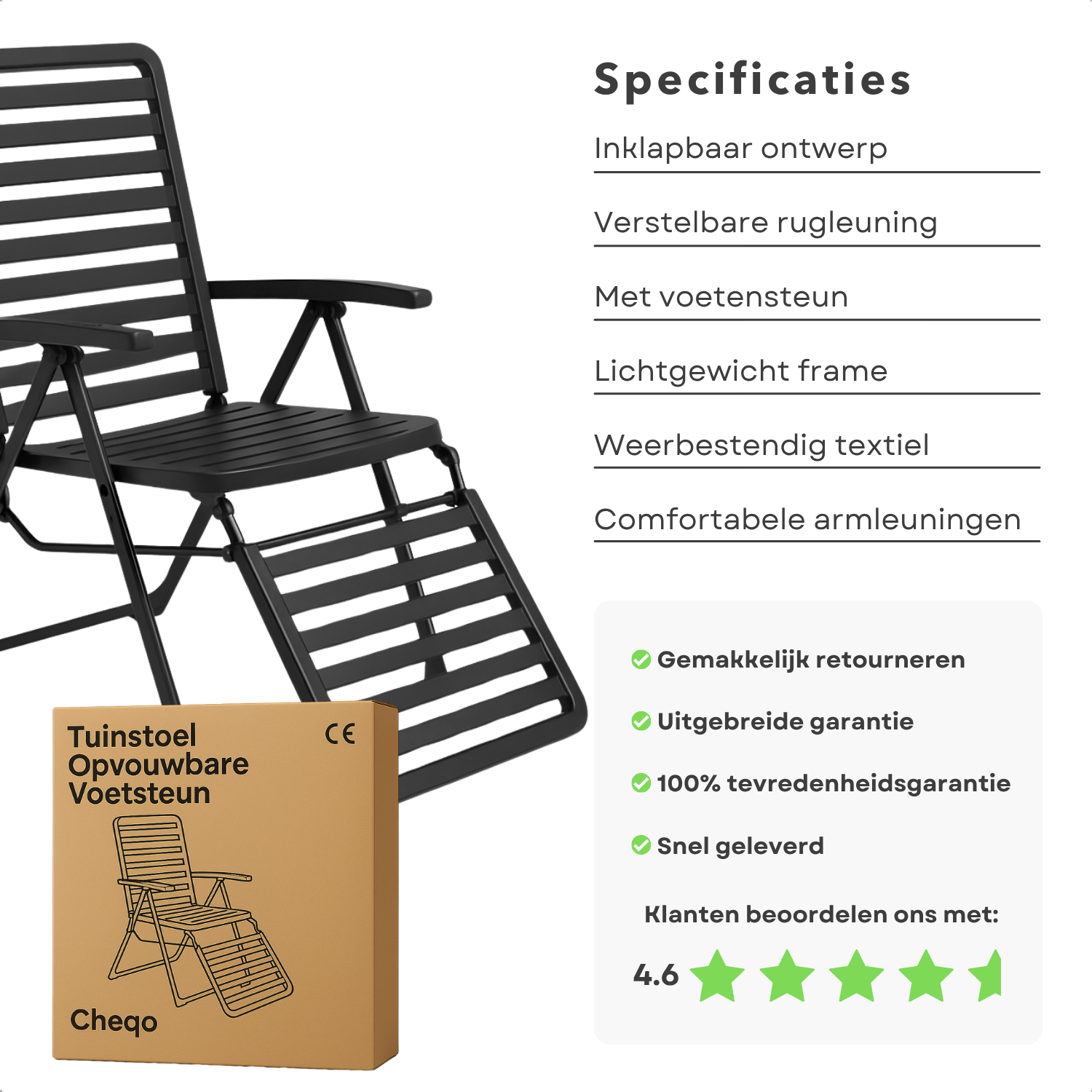 Cheqo® Opvouwbare Tuinstoel met Voetensteun - Camping Stoel - Zonnenbed - Tuin Stoel Lounge - Balkonstoel - Loungestoel - Aluminium Relaxstoel