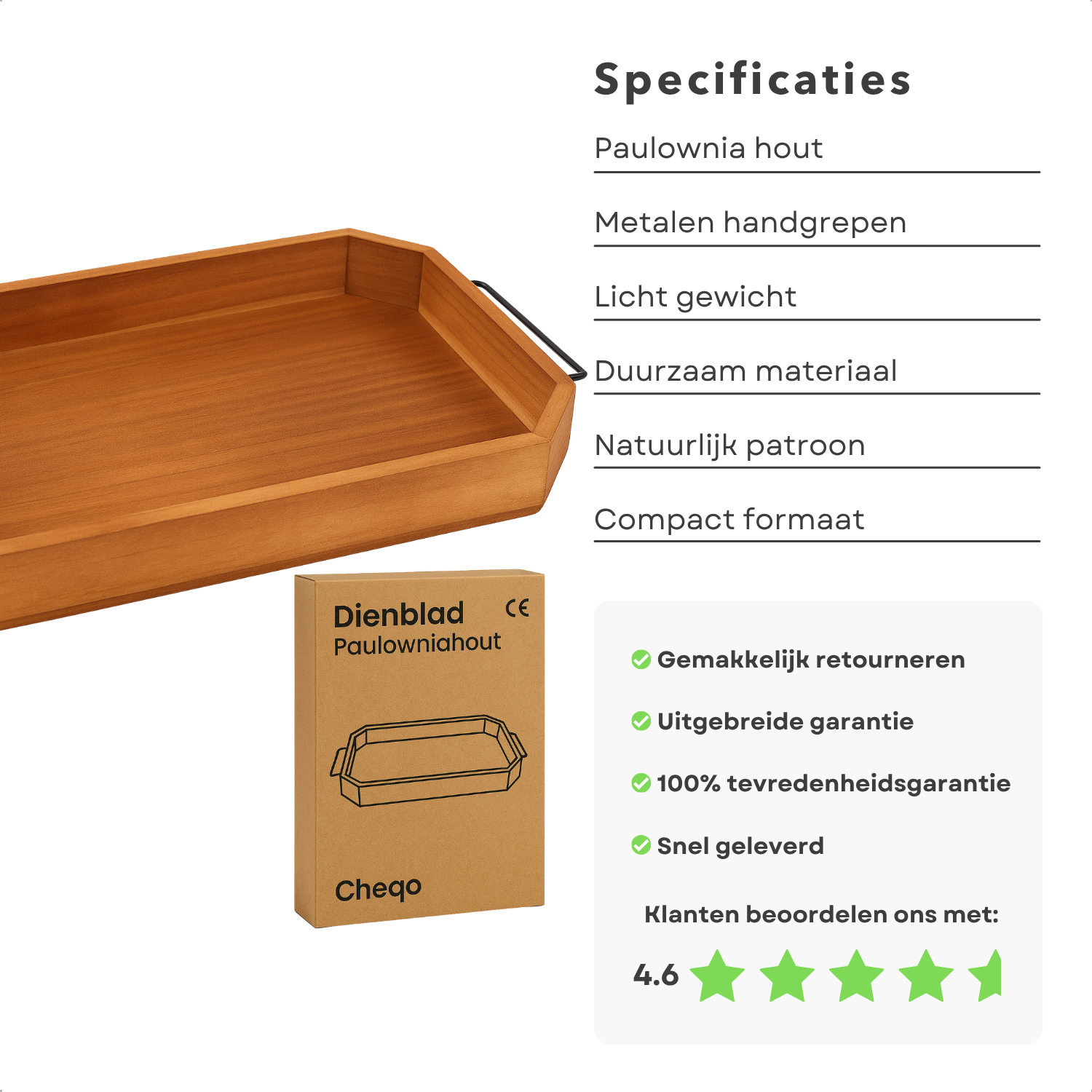 Cheqo® staat voor kwaliteit en duurzaamheid. Dit dienblad is niet alleen praktisch, maar ook een stijlvolle aanvulling op elk interieur. Het paulowniahout is vergelijkbaar met eiken, maar veel lichter, waardoor het ideaal is voor dagelijks gebruik.