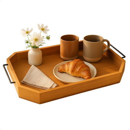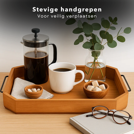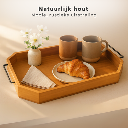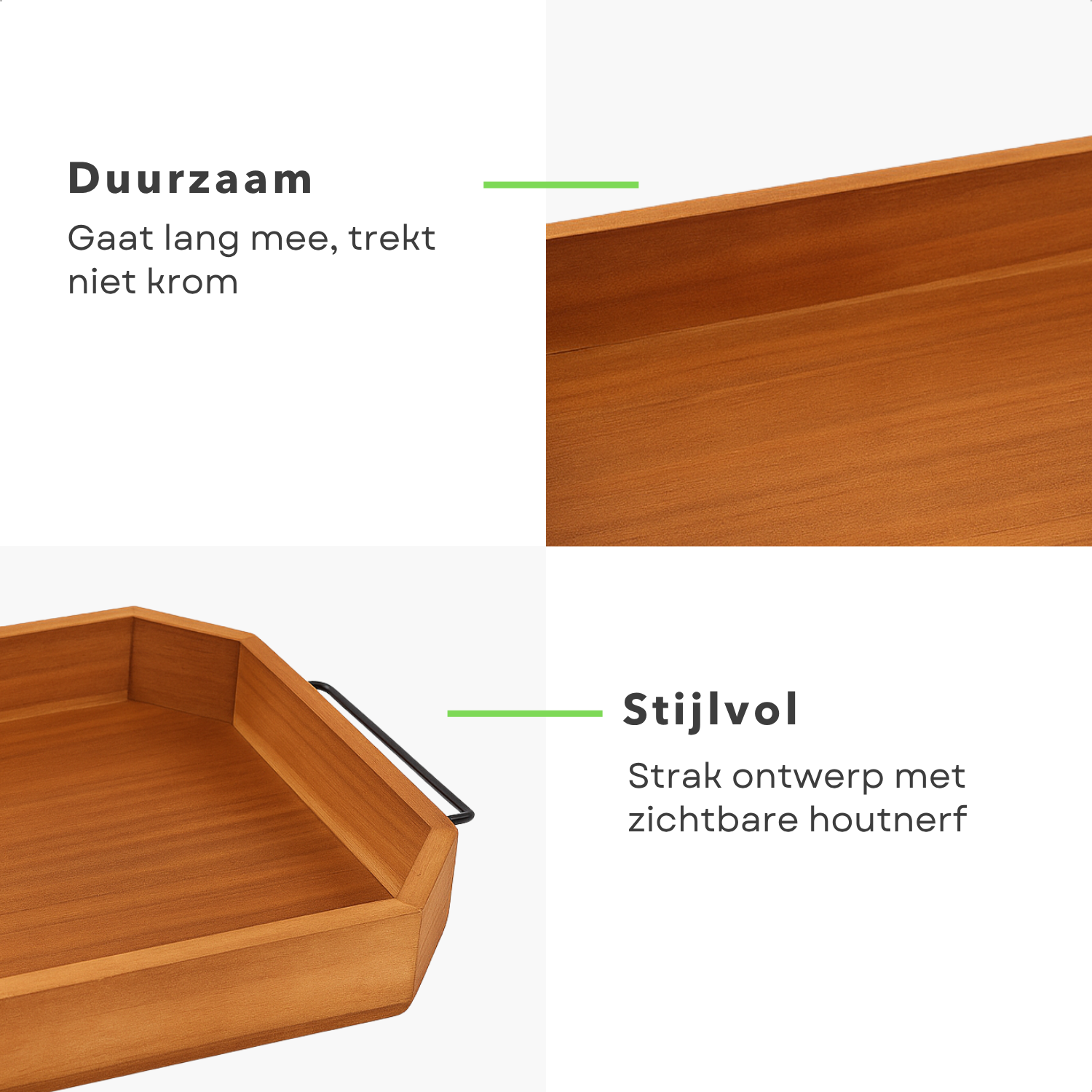 Cheqo® Houten Dienblad - Serveerplateau - Serveerblad - Serveerplank - Ontbijttafel - Ontbijt op Bed - Duurzaam en Lichtgewicht - Metalen Handgrepen