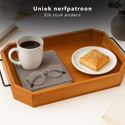 Het Cheqo® dienblad combineert stijl met functionaliteit. Gebruik het voor het serveren van ontbijt op bed of als decoratief stuk in uw woonkamer. De metalen handgrepen zorgen voor een stevige grip, terwijl het lichte gewicht het gemakkelijk maakt om te verplaatsen.