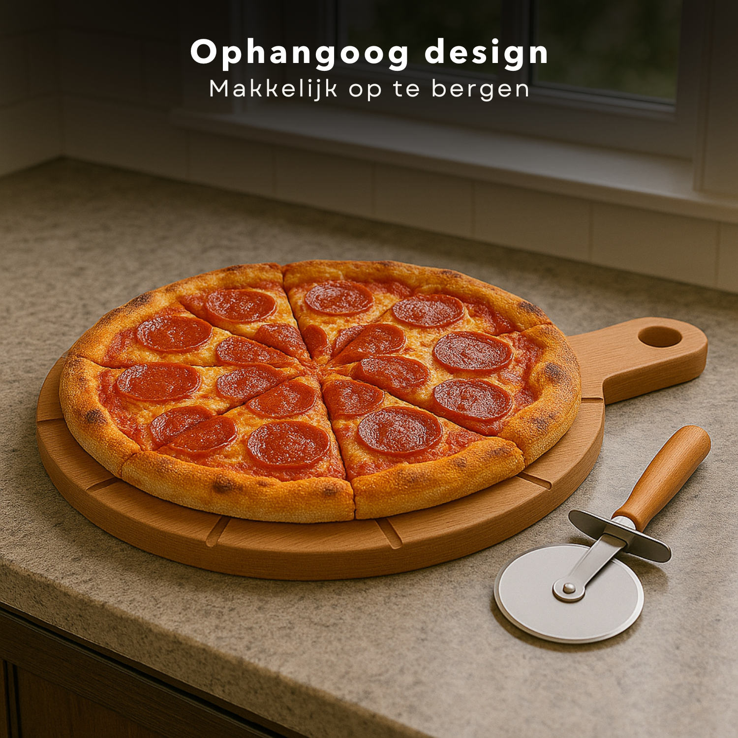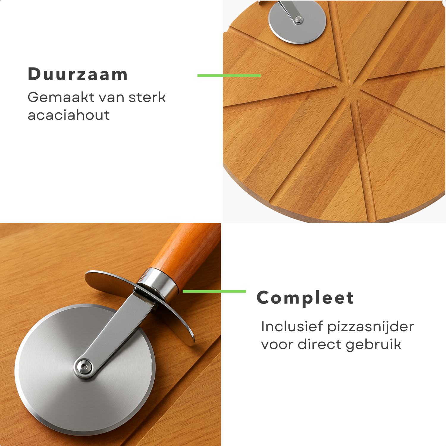 Cheqo® Pizza Snijplank - Pizzaplank - Pizza Plank - Acaciahout Snijplank - Pizzabord Met Groeven - Pizzasnijder Inbegrepen - Snijplank Met Handvat - Ophangoog Snijplank - Pizza Serveren