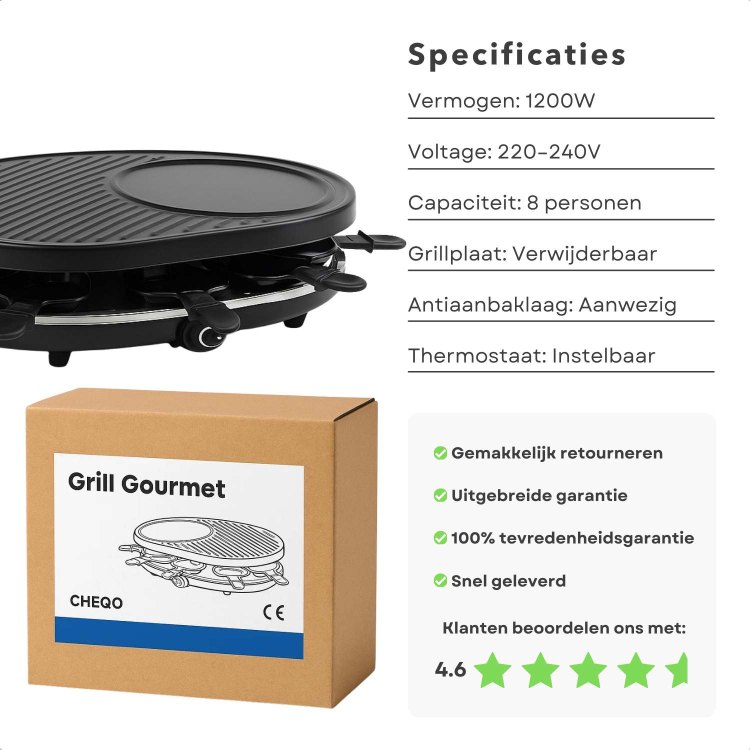 Cheqo® Raclette Grill – Gourmetstel voor 8 Personen – Bakplaat - Verwijderbare Grillplaat – Inclusief Gourmetpannetjes & Spatels – 1200 Watt Vermogen – Eenvoudig Schoon te Maken – Elektrisch Gourmetstel - Gourmetten - Bakplaat