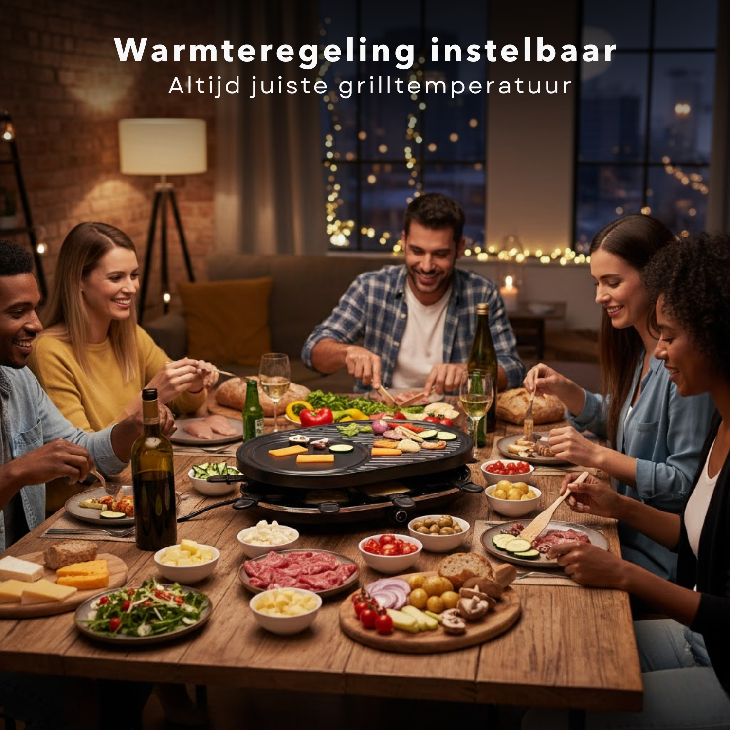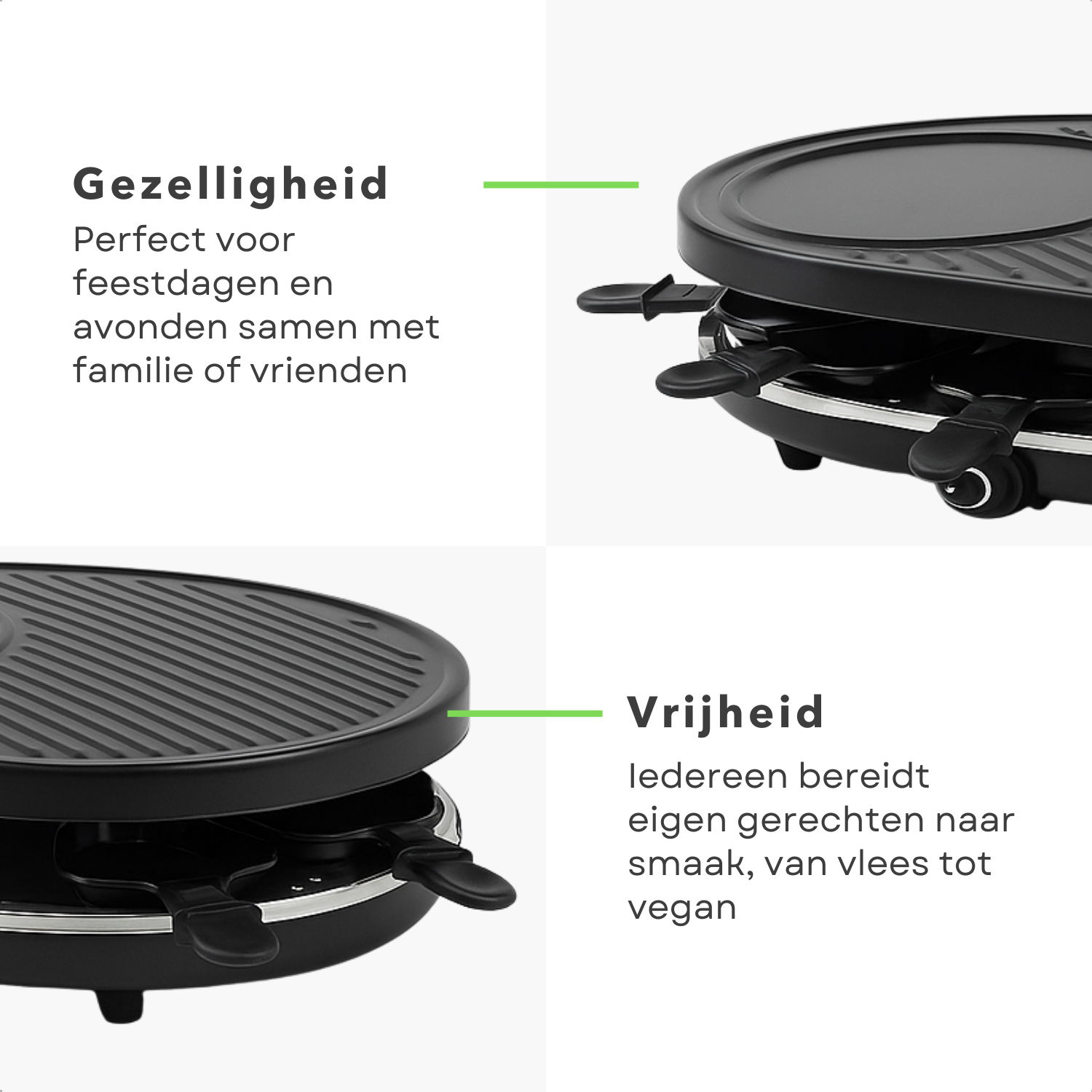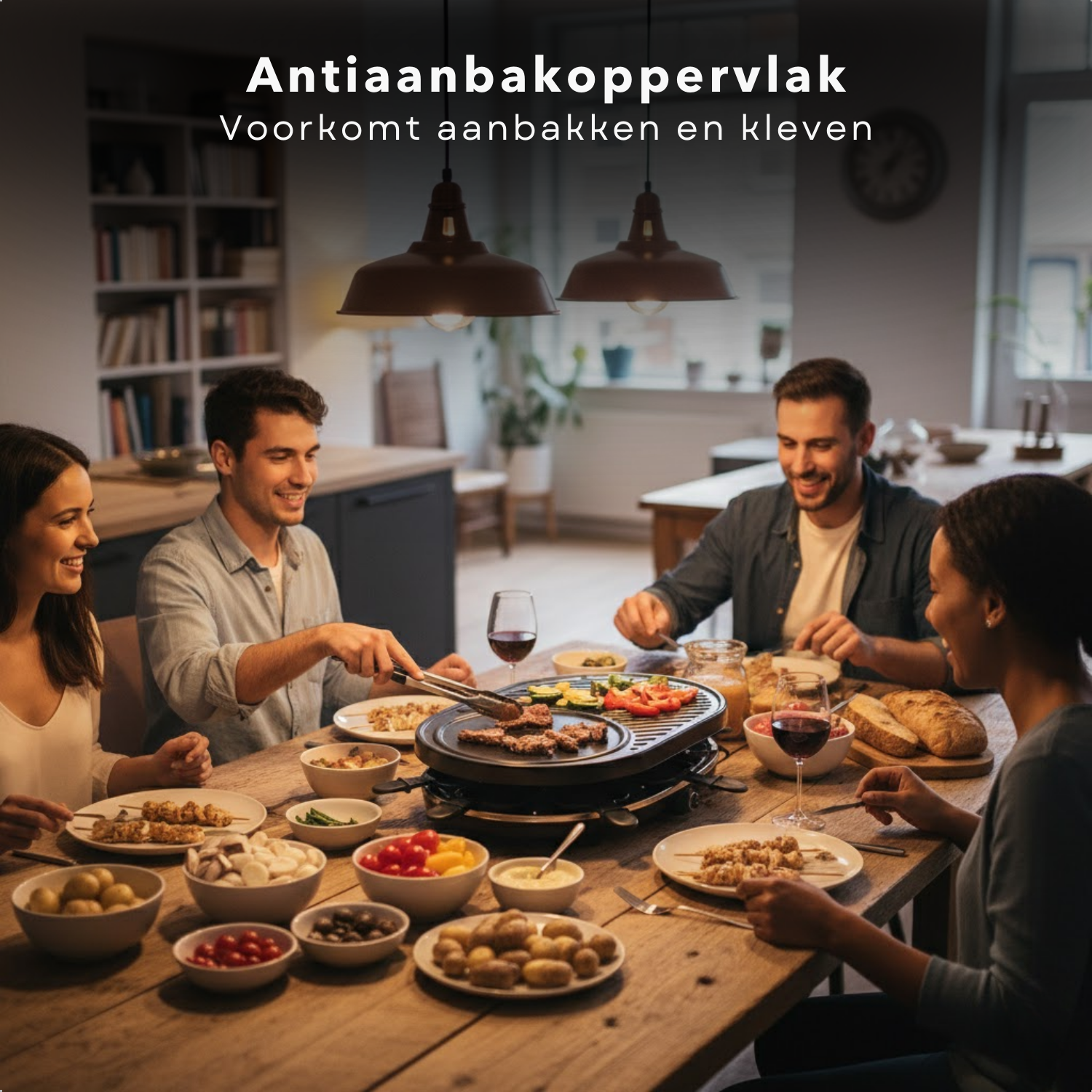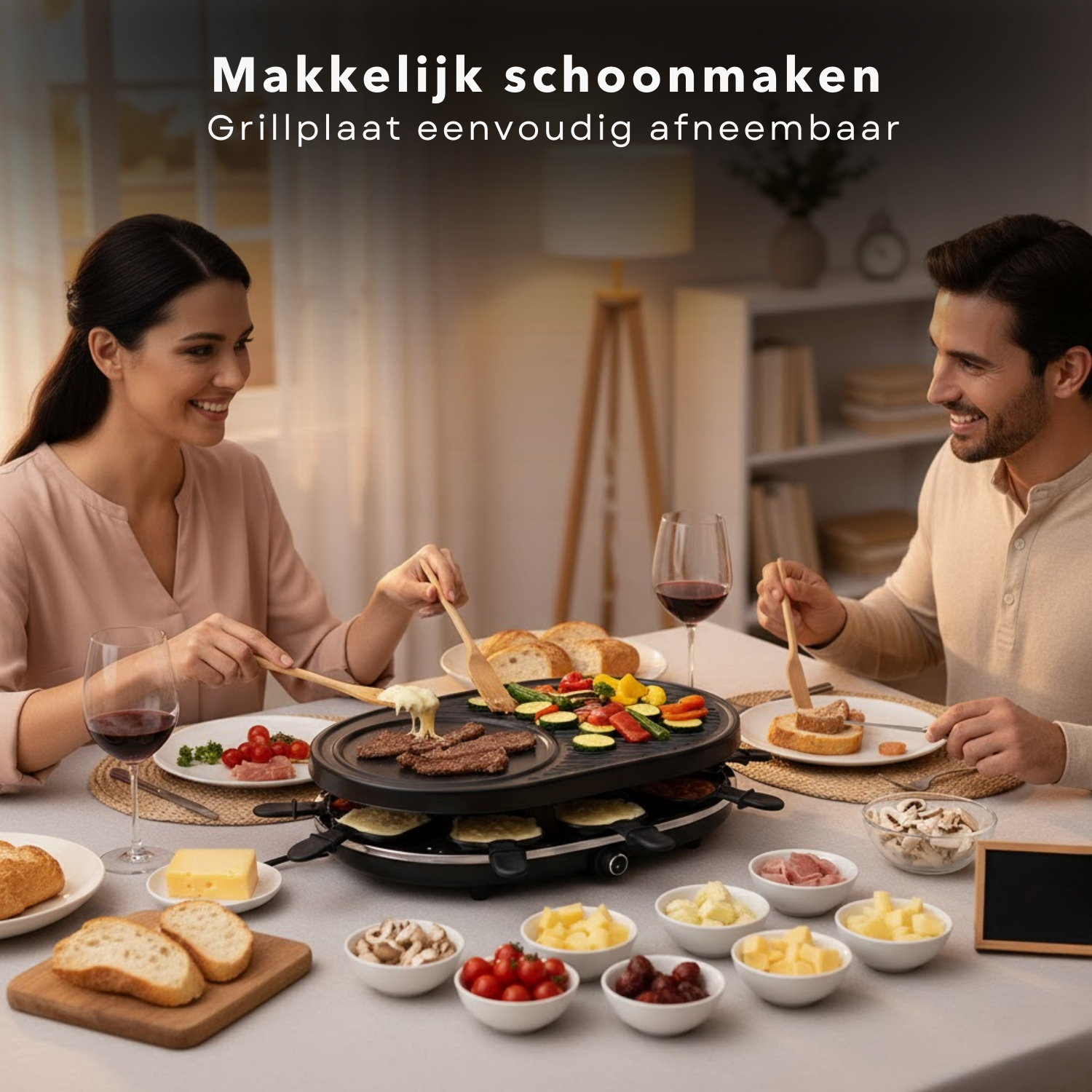 • 2-Laags Design: Grill bovenop (half glad/half geribbeld) en raclettepannetjes onder voor gelijktijdig grillen en smelten.