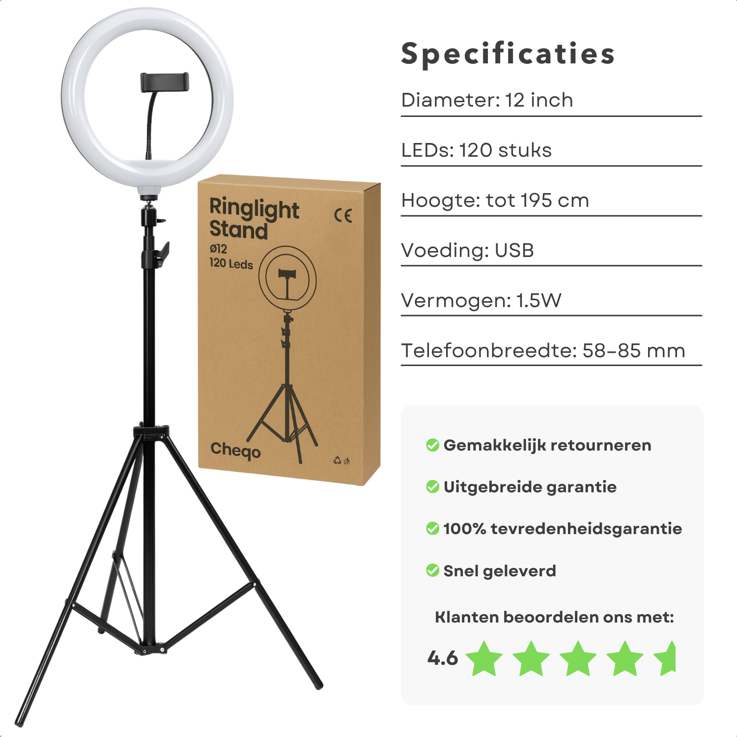Cheqo® Ringlamp met Statief – Selfie Ringlight 12” – 120 LED Lampjes – TikTok Lamp – Dimbaar Licht – 3 Lichtstanden: Cool, Warm & Neutraal – 360° Draaibaar – USB – Universele Telefoonhouder – Vlog & YouTube Licht