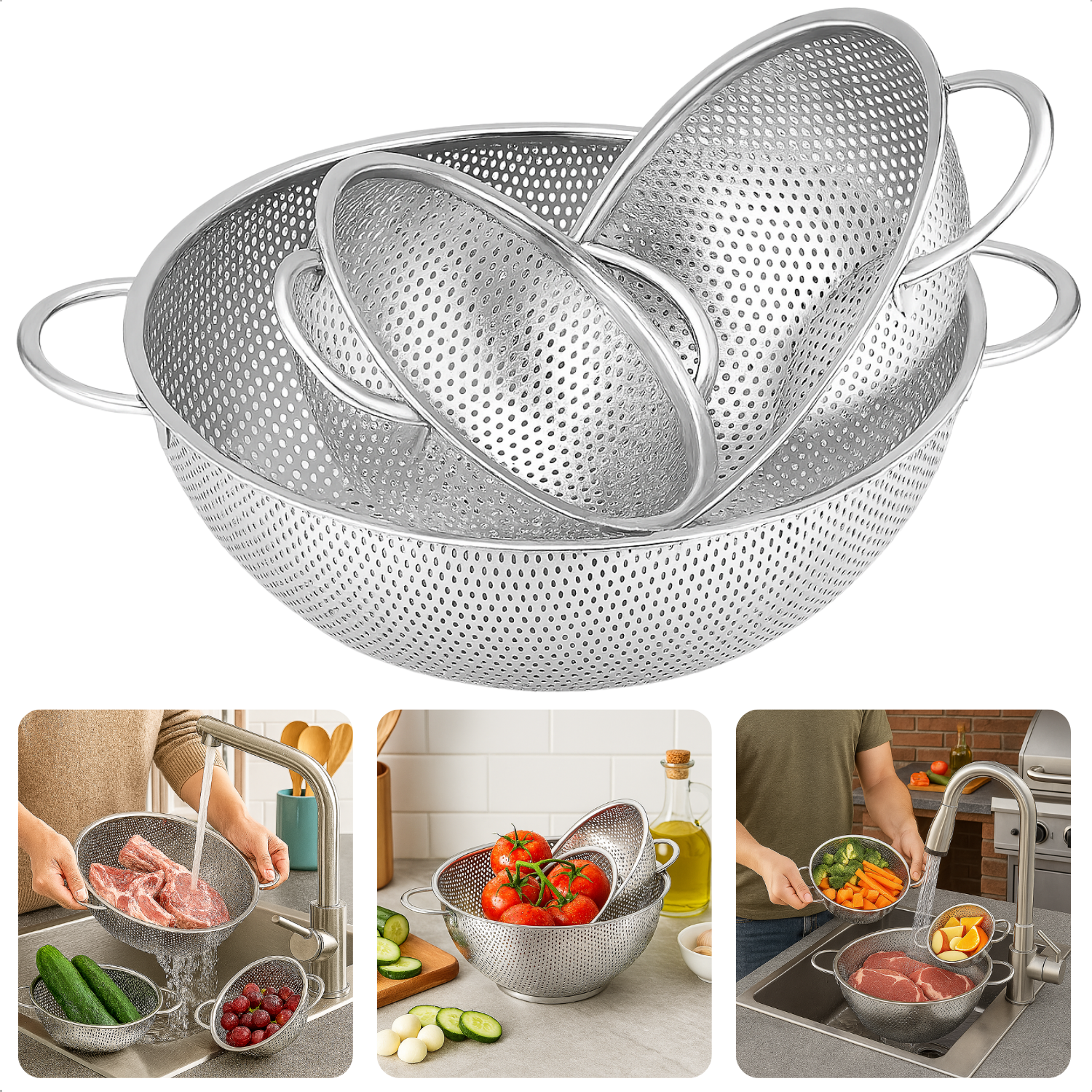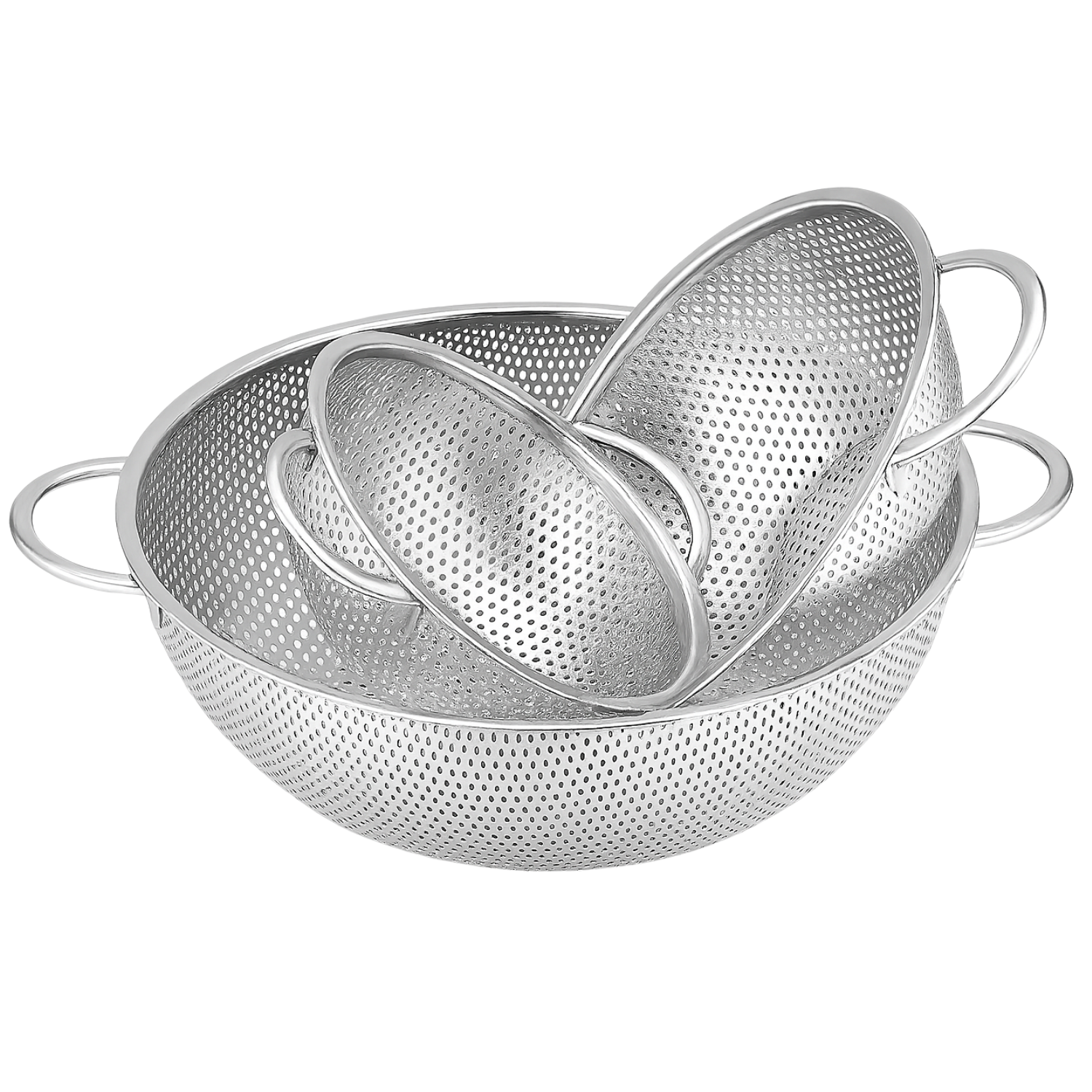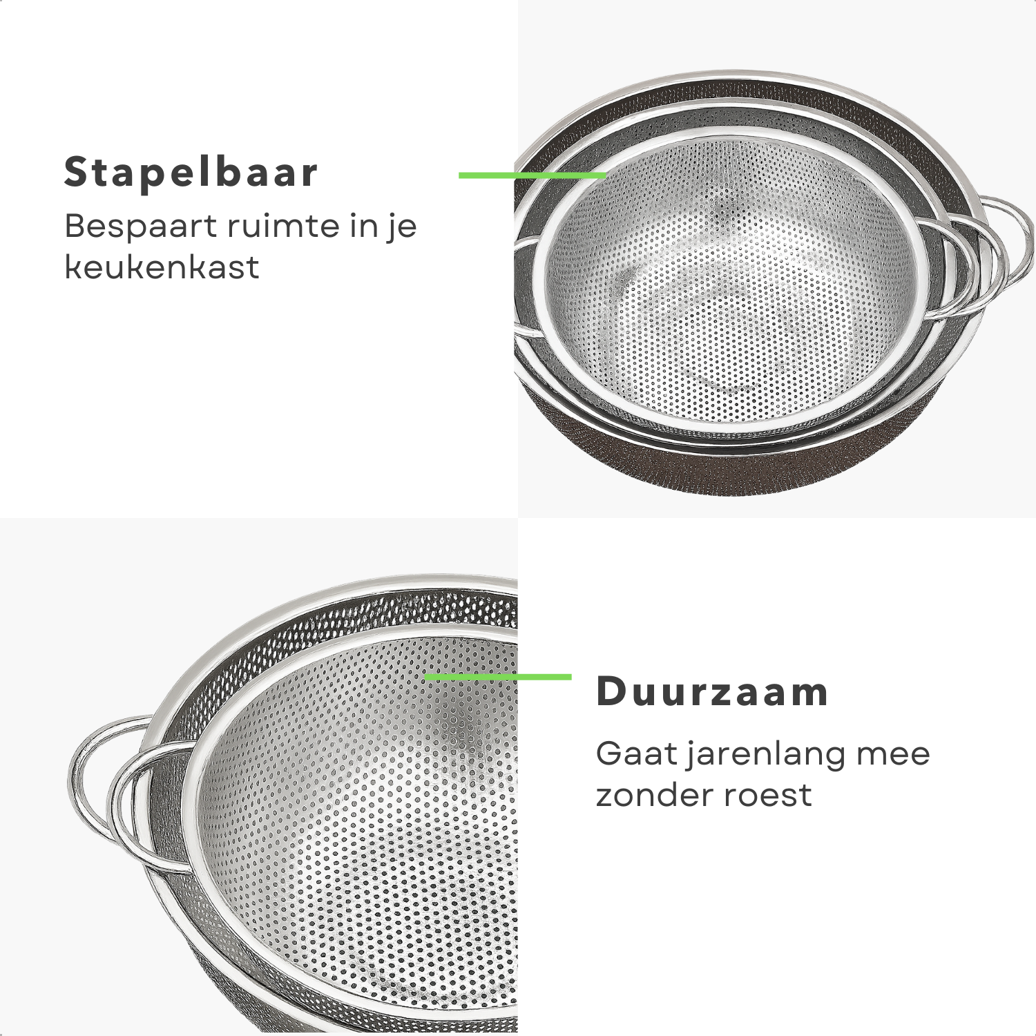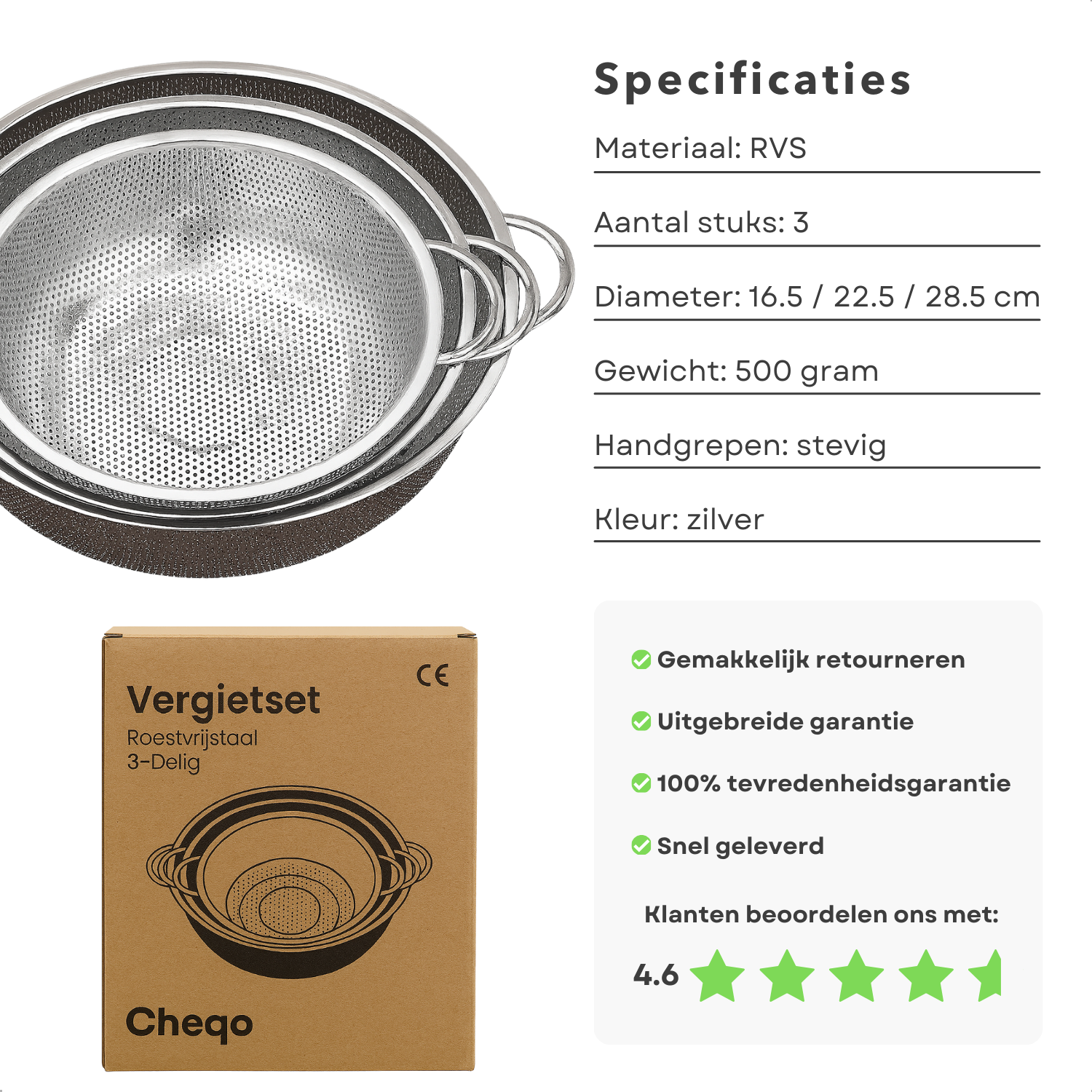 Cheqo® Roestvrijstalen Vergiet - Vergietset 3-Delig - Keukenaccessoire RVS - Verschillende Maten - 16.5 cm Vergiet - 22.5 cm Vergiet - 28.5 cm Vergiet