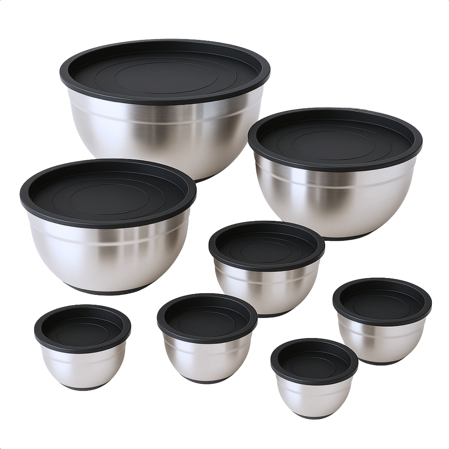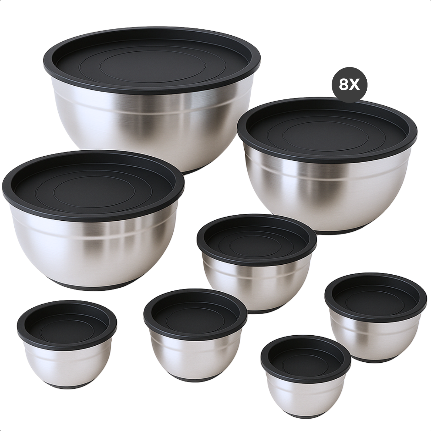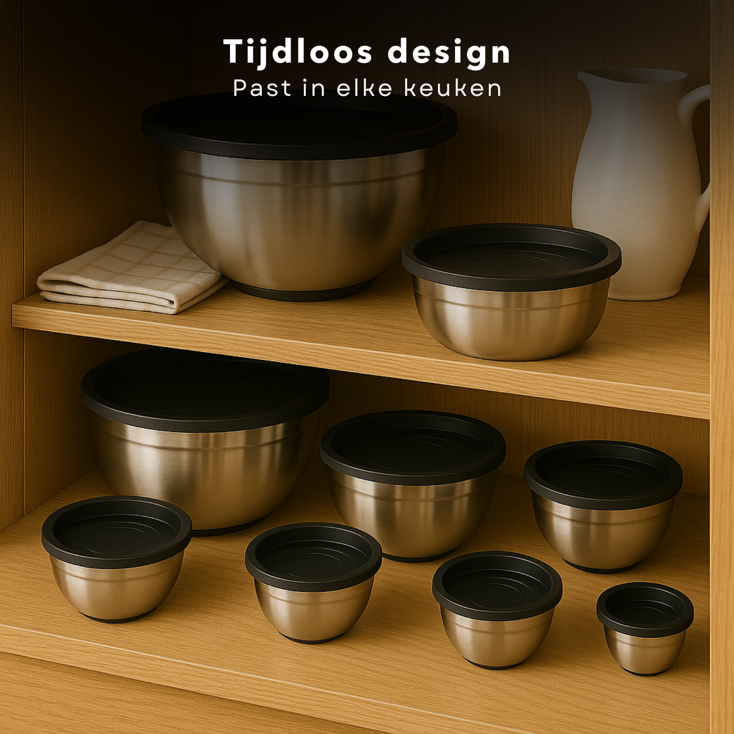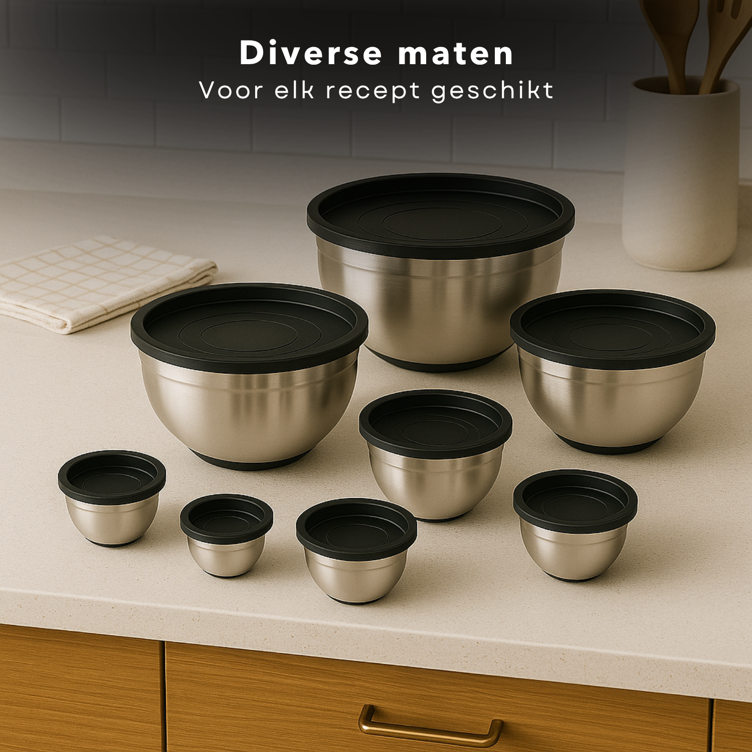 Cheqo® RVS Mengkommen Set - Beslagkommen Set - Mixkom - Kommen Stapelbaar en Met Deksel - 8-delige RVS Beslagkommen