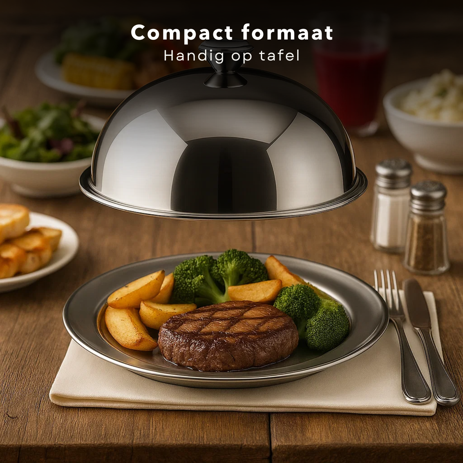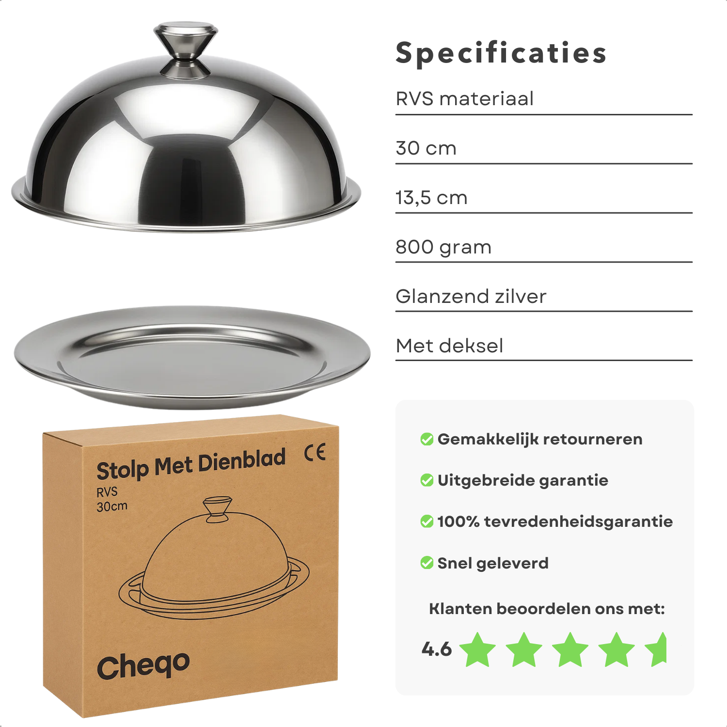 Presenteer je gerechten stijlvol en hygiënisch met de Cheqo RVS stolp met dienblad (30 cm). De glanzende roestvrijstalen kap beschermt... Lees meer