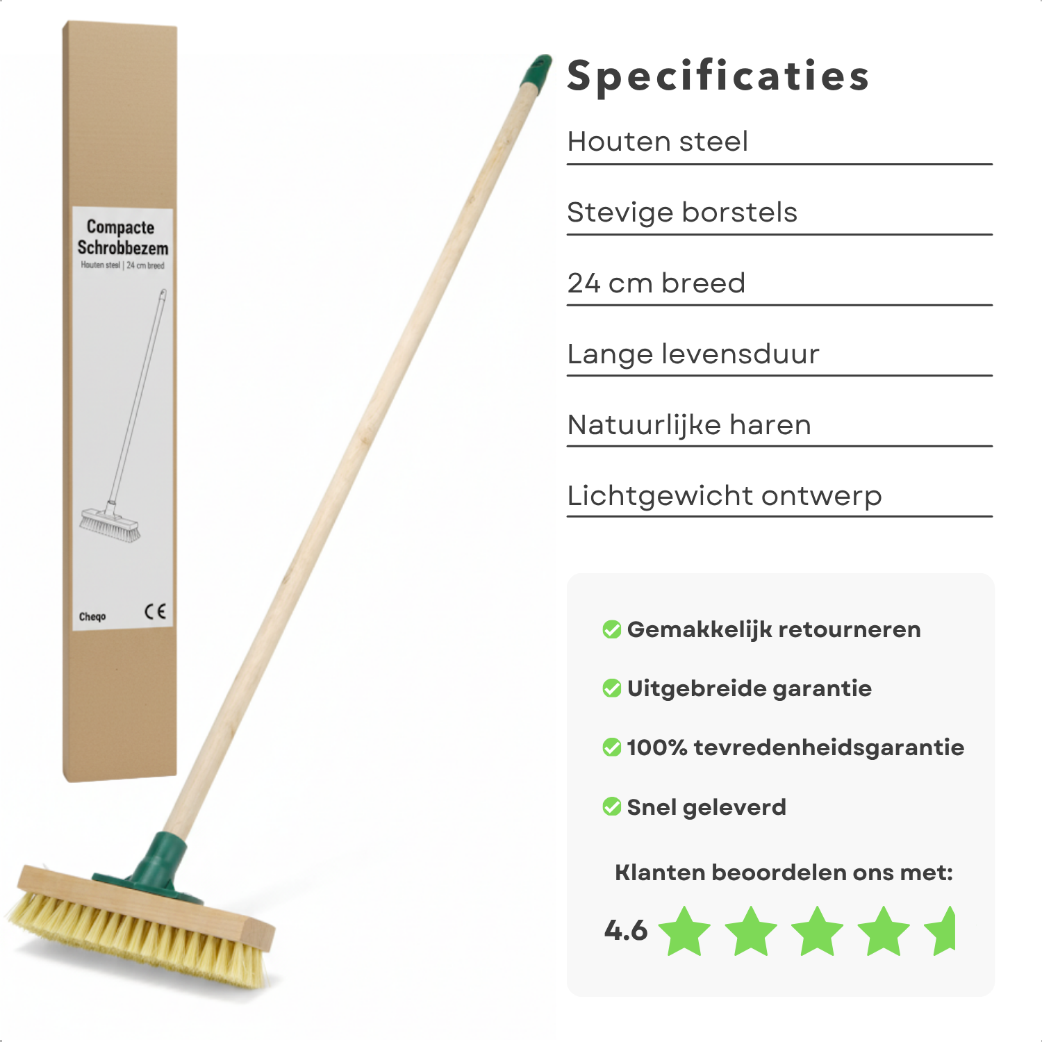 Pak elke schoonmaakklus doelgericht aan met de Cheqo schrobbezem 24 cm met steel en ervaar hoe snel en efficiënt je weer schone, frisse oppervlakken creëert. Voeg hem nu toe aan je schoonmaakarsenaal en ga direct aan de slag.