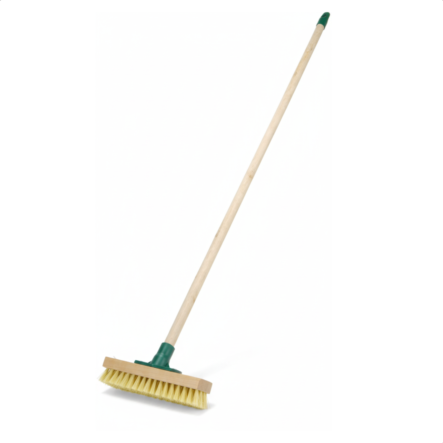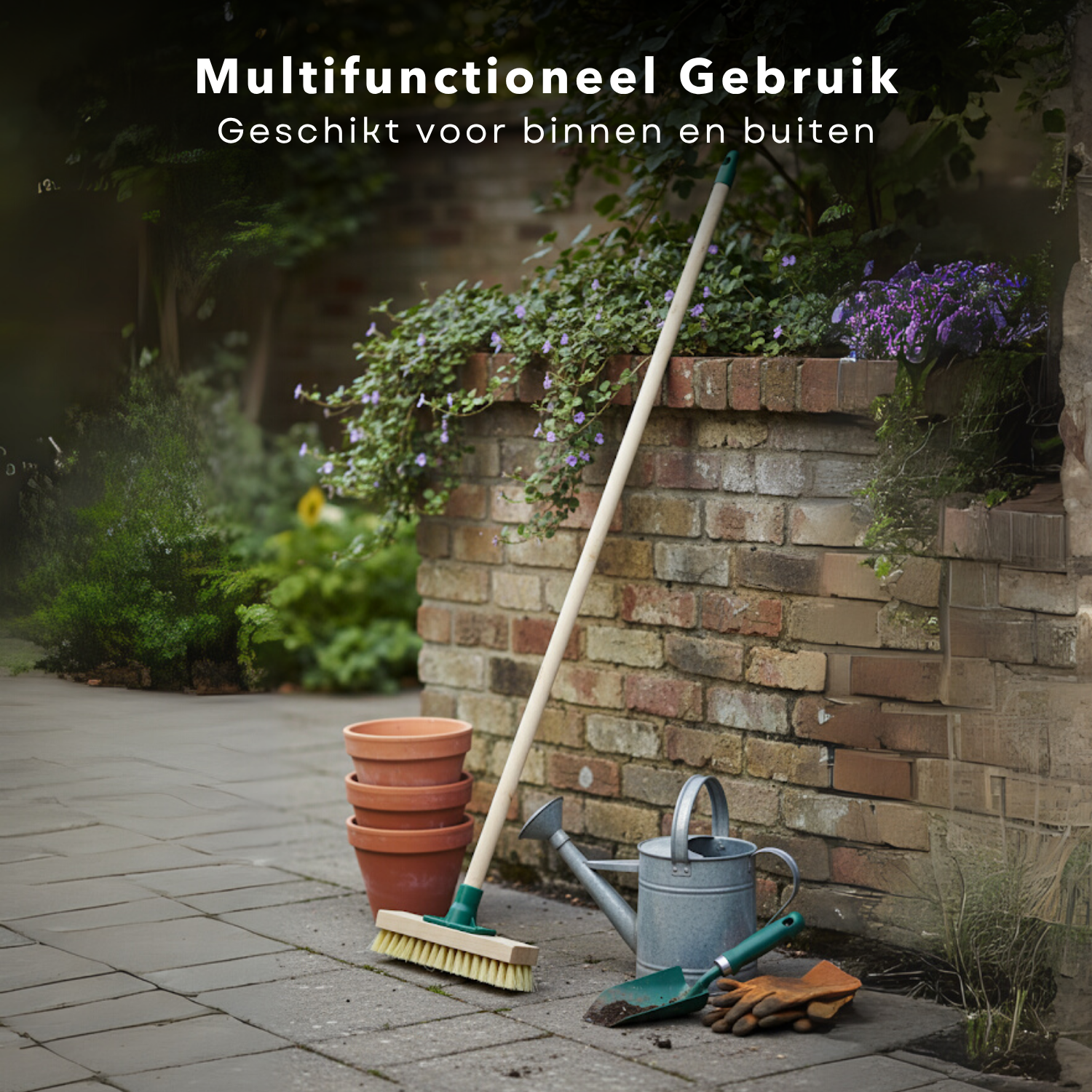 • Is de schrobbezem geschikt voor buiten?: Ja, hij is uitstekend te gebruiken op terrassen, opritten en andere robuuste buitenoppervlakken.