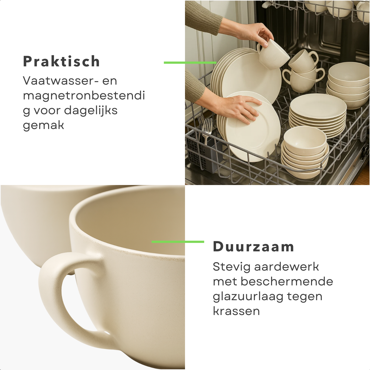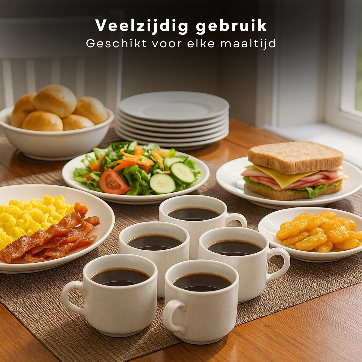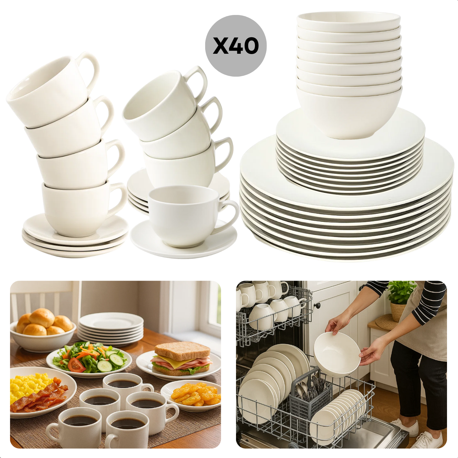 Cheqo® Serviesset 8 Persoons - 40-Delige Serviesset - Witte Serviesset - Aardewerk Servies - Vaatwasserbestendig Servies - Magnetronbestendig Servies - Elegante Tafelsetting - Borden En Kommen - Kopjes Met Schotel - Ronde Borden