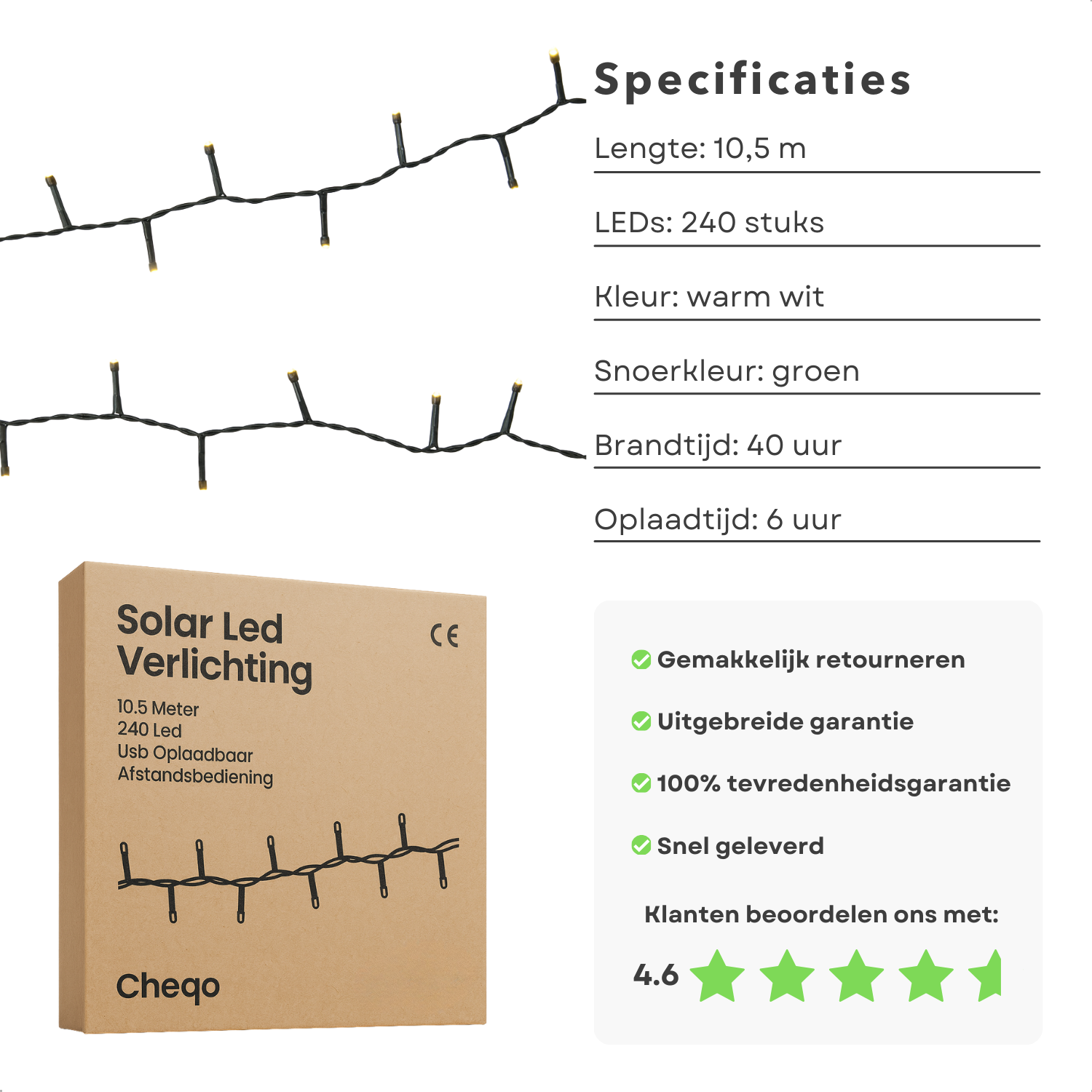 Cheqo® Solar Lichtsnoer - Kerstverlichting Buiten - Kerstboomverlichting - Cluster Verlichting - 10.5 Meter - 240 Led - Met Afstandsbediening - Warm Wit Licht - Tuinverlichting Op Zonne-Energie - Sfeerverlichting Buiten - Lichtslinger - Met Timer
