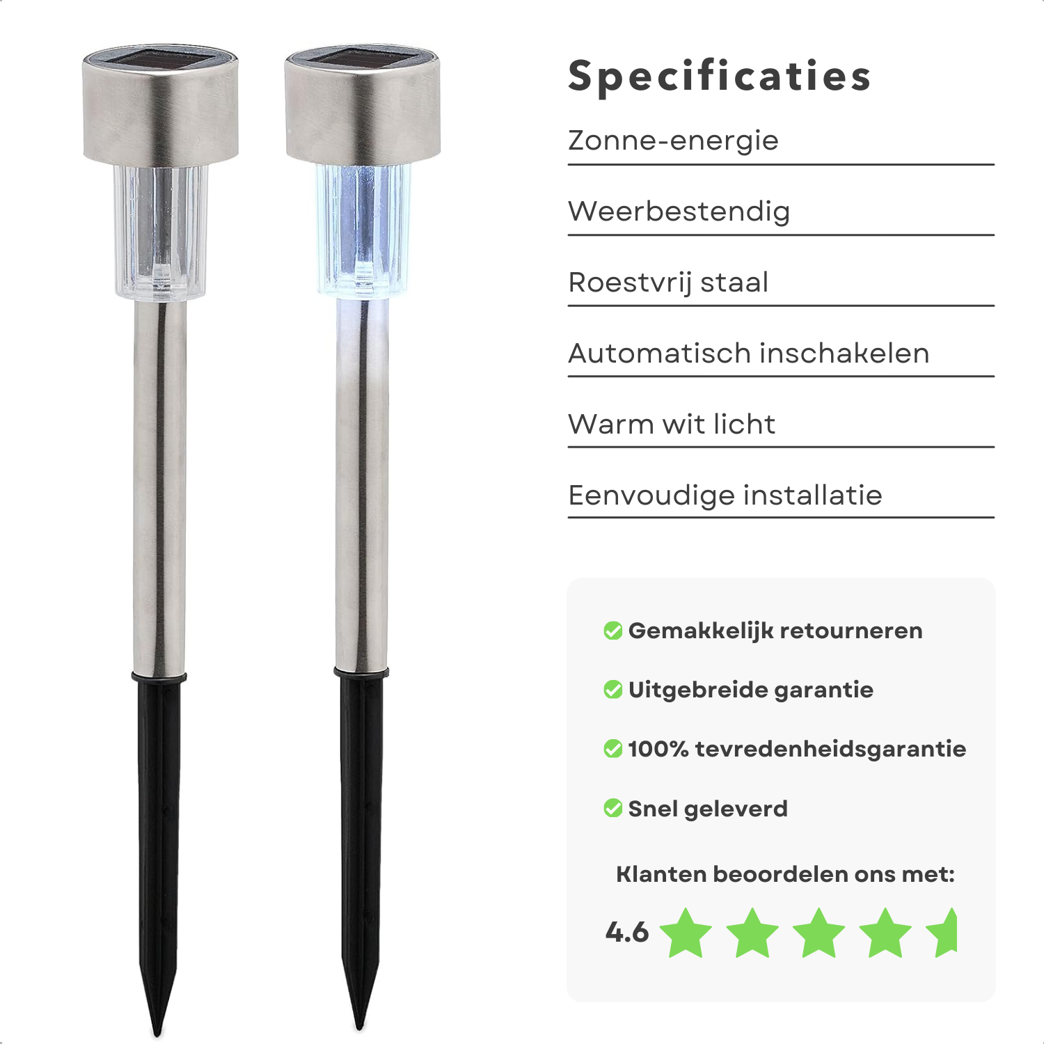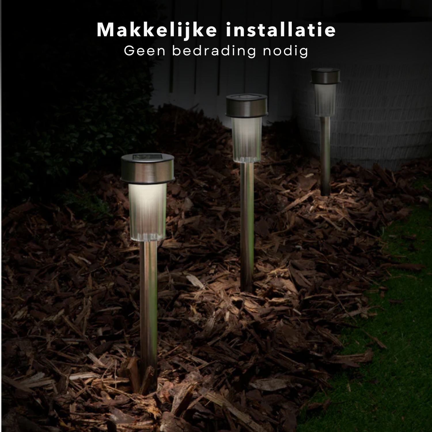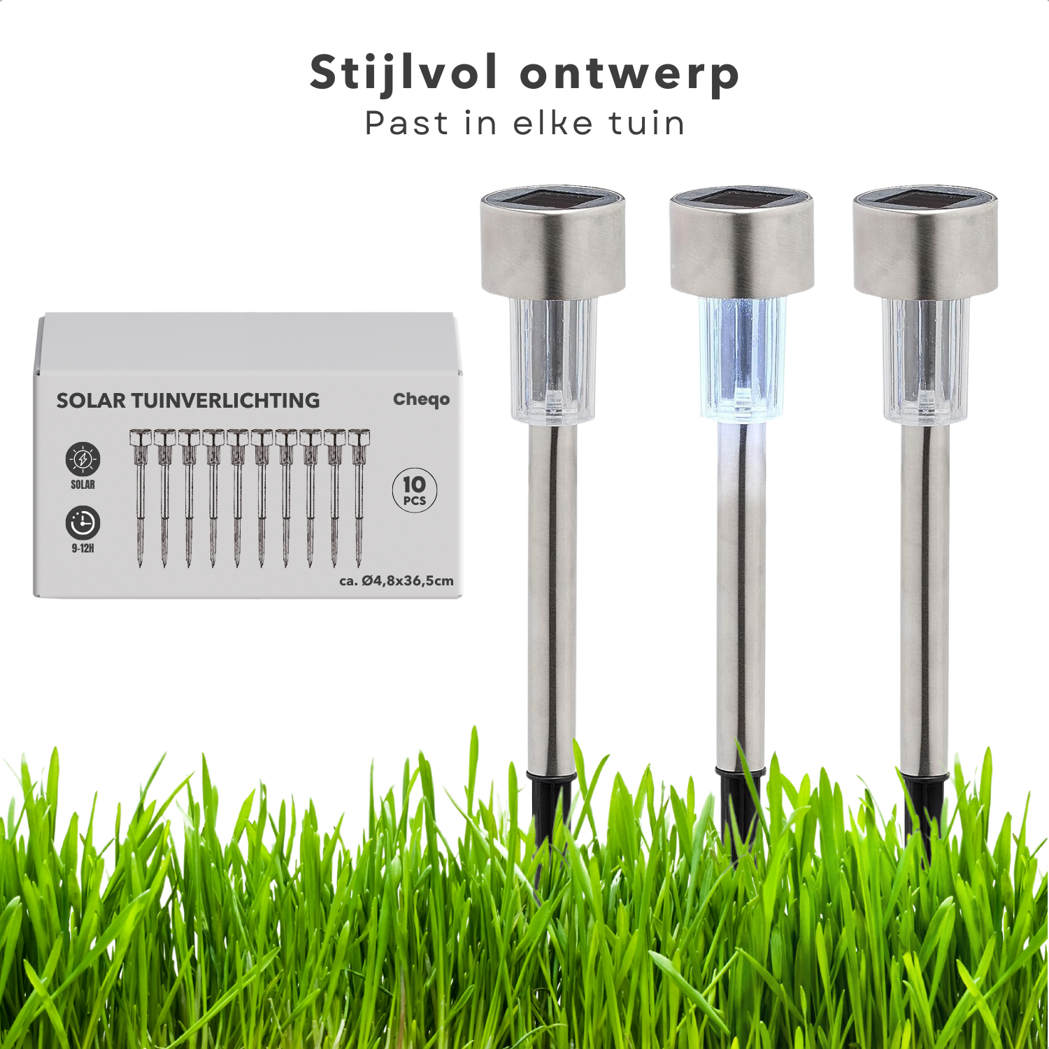 Cheqo® Solar Tuinverlichting Set - Padverlichting - 10 Stuks - RVS - Prikspots - Weerbestendig - Tuinspot met Grondspies Set - Buitenverlichting op Zonne-energie