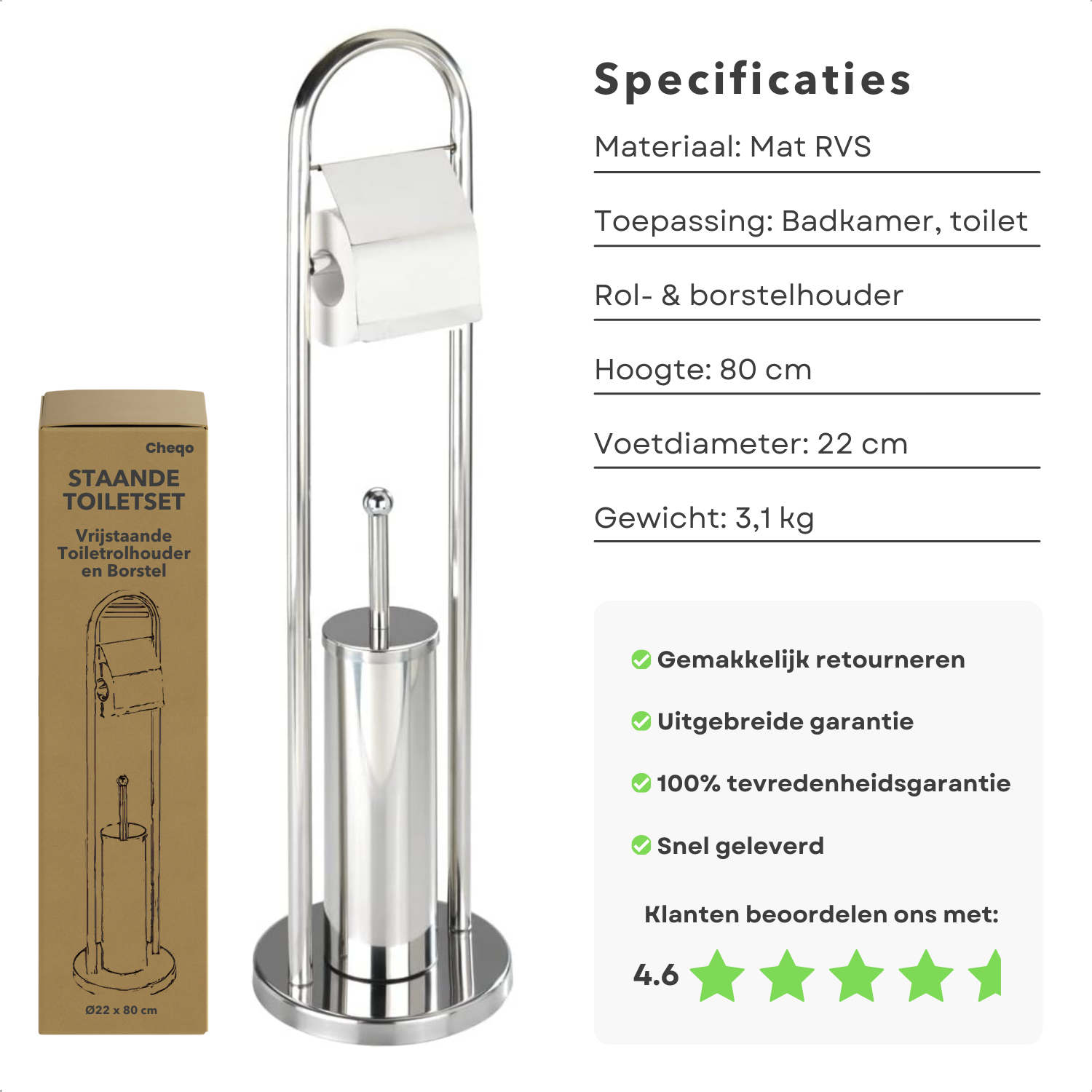 De Cheqo® Staande Toiletset combineert elegantie met functionaliteit. Het vrijstaande ontwerp maakt het eenvoudig om de set te verplaatsen, terwijl de mat RVS afwerking een stijlvolle toevoeging is aan elke badkamer.