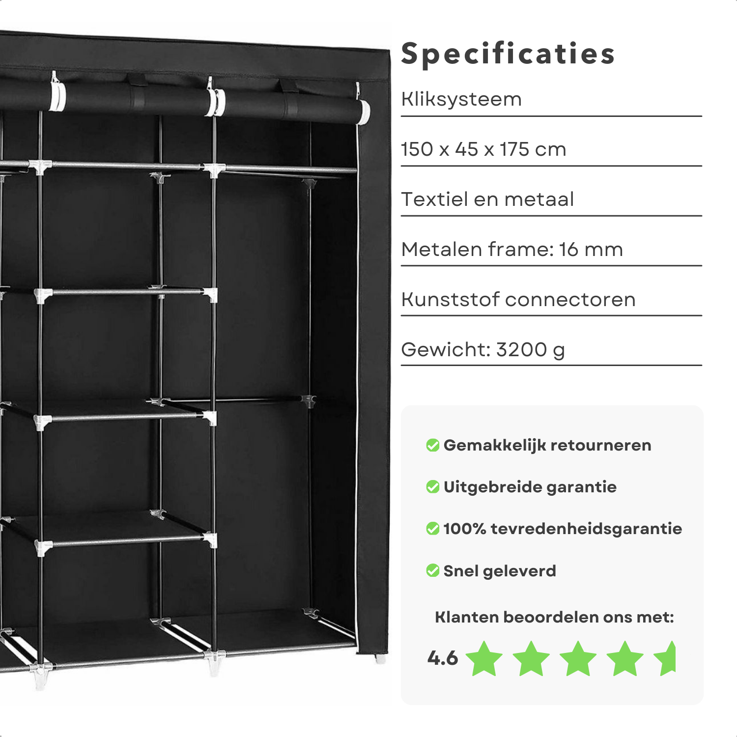 Cheqo® XXL Kledingkast - Opvouwbare Garderobekast - Campingkast - Slaapkamer Kast - Kleerkast - Zwart - Metalen Frame